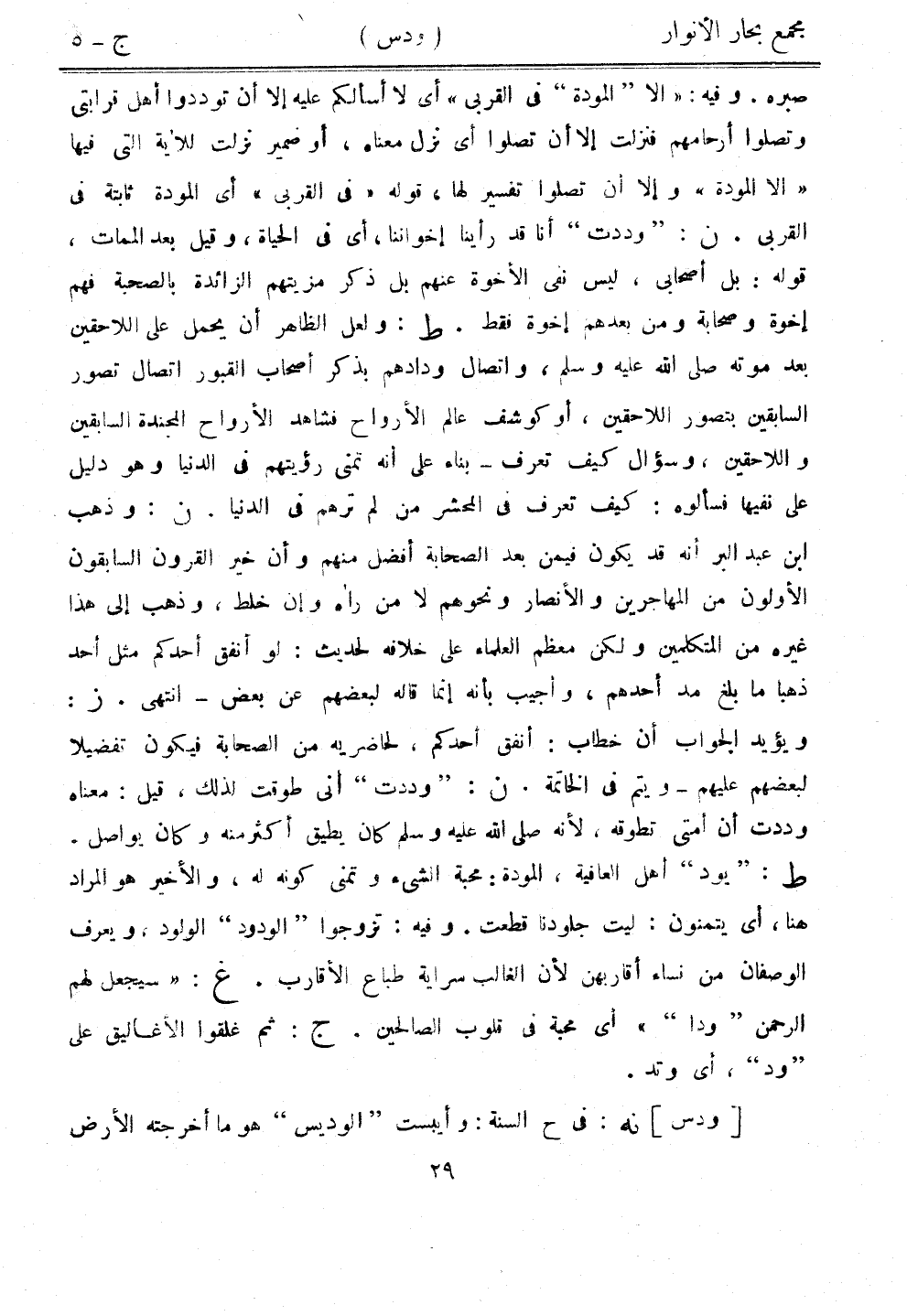 صبره. وفيه: "إلا "المودة" في القربى" أي لا أسألكم عليه إلا أن توددوا أهل قرابتي وتصلوا أرحامهم فنزلت إلا أن تصلوا أي نزل معناه، أو ضمير نزلت للآية التي فيها "إلا المودة" وألا أن تصلوا تفسير لها، قوله "في القربى" أي المودة ثابتة في القربى. ن: "وددت" أنا قد رأينا إخواننا، أي في الحياة، وقيل بعد الممات، قوله: بل أصحابي، ليس نفي الأخوة عنهم بل ذكر مزيتهم الزائدة بالصحبة فهم إخوة وصحابة ومن بعدهم إخوة فقط. ط: ولعل الظاهر أن يحمل على اللاحقين بعد موته صلى الله عليه وسلم، واتصال ودادهم بذكر أصحاب القبور اتصال تصور السابقين يتصور اللاحقين، أو كوشف عالم الأرواح فشاهد الأرواح المجندة السابقين واللاحقين، وسؤال كيف تعرف - بناء على أنه تمنى رؤيتهم في الدنيا وهو دليل على نفيها فسألوه: كيف تعرف في المحشر من لم ترهم في الدنيا. ن: وذهب ابن عبد البر أنه قد يكون فيمن بعد الصحابة أفضل منهم وأن خير القرون السابقون الأولون من المهاجرين والأنصار ونحوهم لا من رآه وإن خلط، وذهب إلى هذا غيره من المتكلمين ولكن معظم العلماء على خلافه لحديث: لو أنفق أحدكم مثل أحد ذهبًا ما بلغ مد أحدهم، وأجيب بأنه إنما قاله لبعضهم عن بعض - انتهى. ز: ويؤيد الجواب أن خطاب: أنفق أحدكم، لحاضريه من الصحابة فيكون تفضيلًا لبعضهم عليهم- ويتم في الخاتمة. ن: "وددت" أني طوقت لذلك، قيل: معناه وددت أن أمتي تطوقه، لأنه صلى الله عليه وسلم كان يطيق أكثر منه وكان يواصل. ط: "يود" أهل العافية، المودة: محبة الشيء وتمنى كونه له، والأخير هو المراد هنا، أي يتمنون: ليت جلودنا قطعت. وفيه: تزوجوا "الودود" الولود، ويعرف الوصفان من نساء أقاربهن لأن الغالب سراية طباع الأقارب. غ: "سيجعل لهم الرحمن "ودا"" أي محبة في قلوب الصالحين. ج: ثم غلقوا الأغاليق على "ود"، أي وتد.