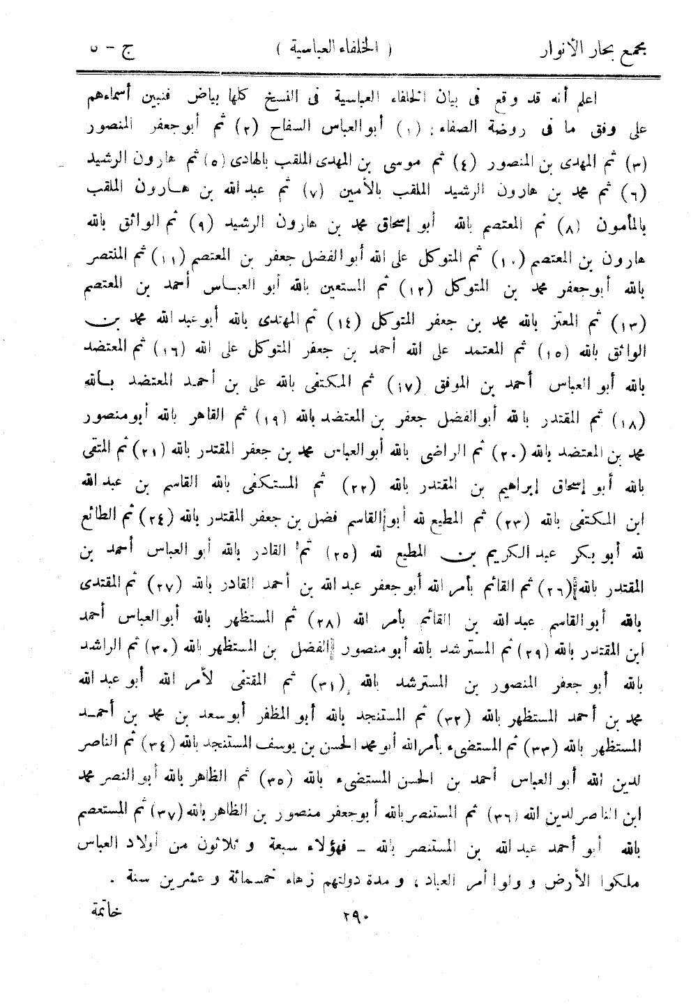 اعلم أنه قد وقع في بيان الخلفاء العباسية في النسخ كلها بياض فنبين أسماءهم على وفق ما في روضة الصفاء: أبو العباس السفاح ثم أبو جعفر المنصور ثم المهدي بن المنصور ثم موسى بن المهدي الملقب بالهادي ثم هارون الرشيد ثم محمد بن هارون الرشيد الملقب بالأمين ثم عبد الله بن هارون الملقب بالمأمون ثم المعتصم بالله أبو إسحاق محمد بن هارون الرشيد ثم الواثق بالله هارون بن المعتصم ثم المتوكل على الله أبو الفضل جعفر بن المعتصم ثم المنتصر بالله أبو جعفر محمد بن المتوكل ثم المستعين بالله أبو العباس أحمد بن المعتصم ثم المعتز بالله محمد بن جعفر المتوكل ثم المهتدي بالله أبو عبد الله محمد بن الواثق بالله ثم المعتمد على الله أحمد بن جعفر المتوكل على الله ثم المعتضد بالله أبو العباس أحمد بن الموفق ثم المكتفي بالله علي بن أحمد المعتضد بالله ثم المقتدر بالله أبو الفضل جعفر بن المعتضد بالله ثم القاهر بالله أبو منصور محمد بن المعتضد بالله ثم الراضي بالله أبو العباس محمد بن جعفر المقتدر بالله ثم المتقي بالله أبو إسحاق إبراهيم بن المقتدر بالله ثم المستكفي بالله القاسم بن بد الله ابن المكتفي بالله ثم المطيع لله أبو القاسم فضل بن جعفر المقتدر بالله ثم الطائع لله أبو بكر عبد الكريم بن المطيع لله ثم القادر بالله أبو العباس أحمد بن المقتدر بالله ثم القائم بأمر الله أبو جعفر عبد الله بن أحمد القادر بالله ثم المقتدي بالله أبو القاسم عبد الله بن القائم بأمر الله ثم المستظهر بالله أبو العباس أحمد ابن المقتدر بالله ثم المسترشد بالله أبو منصور الفضل بن المستظهر الله ثم الراشد بالله أبو جعفر المنصور بن المسترشد بالله ثم المقتفي لأمر الله أبو عبد الله محمد بن أحمد المستظهر بالله ثم المستنجد بالله أبو المظفر أبو سعد بن محمد بن أحمد المستظهر بالله ثم المستضيء بأمر الله أبو محمد الحسن بن يوسف المستنجد بالله ثم الناصر لدين الله أبو العباس أحمد بن الحسن المستضيء بالله ثم الظاهر بالله أبو النصر محمد ابن الناصر لدين الله ثم المستنصر بالله أبو جعفر منصور بن الظاهر بالله ثم المستعصم بالله ابو أحمد عبد الله بن المستنصر بالله - فهؤلاء سبعة وثلاثون من أولاد العباس ملكوا الأرض وولوا أمر العباد، ومدة دولتهم زهاء خمسمائة وعشرين سنة.