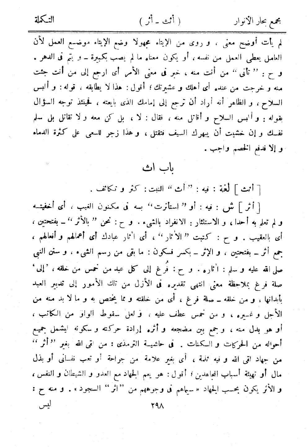 [أثر] ش: فيه: أو"استأثرت" به في مكنون الغيب، أي أخفيته ولم تعلم به أحدًا، والاستئثار: الانفراد بالشيء. وح: نحن "بالأثر" - بفتحتين، أي بالعقيب. وح: تبت "الآثار"، أي آثار عبادك أي أعمالهم وأفعالهم، جمع أثر - بفتحتين، والإثر - بكسر فسكون: ما بقي من رسم الشيء، وسنن النبي صلى الله عليه وسلم: آثاره. وح: فُرغ إلى كل عبد من خمس من خلقه، "إلى" صلة فرغ بملاحة معنى انتهى تقديره في الأزل من تلك الأمور إلى تدبير العبد بأبدانها، ومن خلقه - صلة فُرغ إلى كل عبد من خمس من خلقه، "إلى" صلة فرغ بملاحظة معنى انتهى تقديره في الأزل من تلك الأمور إلى تدبير العبد بأبدانها، ومن خلقه - صلة فرغ، أي من خلقته ومما يختص به وما لابد منه من الأجل وغيره، ومن خمس عطف عليه، ولعل سقوط الواو من الكاتب، أو هو بدل منه، وجمع بين مضجعه وأثره إرادة حركته وسكونه ليشمل جميع أحواله من الحركات والسكنات. في حاشية الترمذي: من لقي الله بغير "أثر" من جهاد لقي الله وفيه ثلمة، أي بغير علامة من جراحة أو تعب نفساني أو بذل مال أو تهيئة أسباب المجاهدين، أقول: هو يعم الجهد مع العدو والشيطان والنفس، والأثر يكون بحسب الجهاد "سيماهم في وجوههم من "أثر" السجود". ومنه ح: