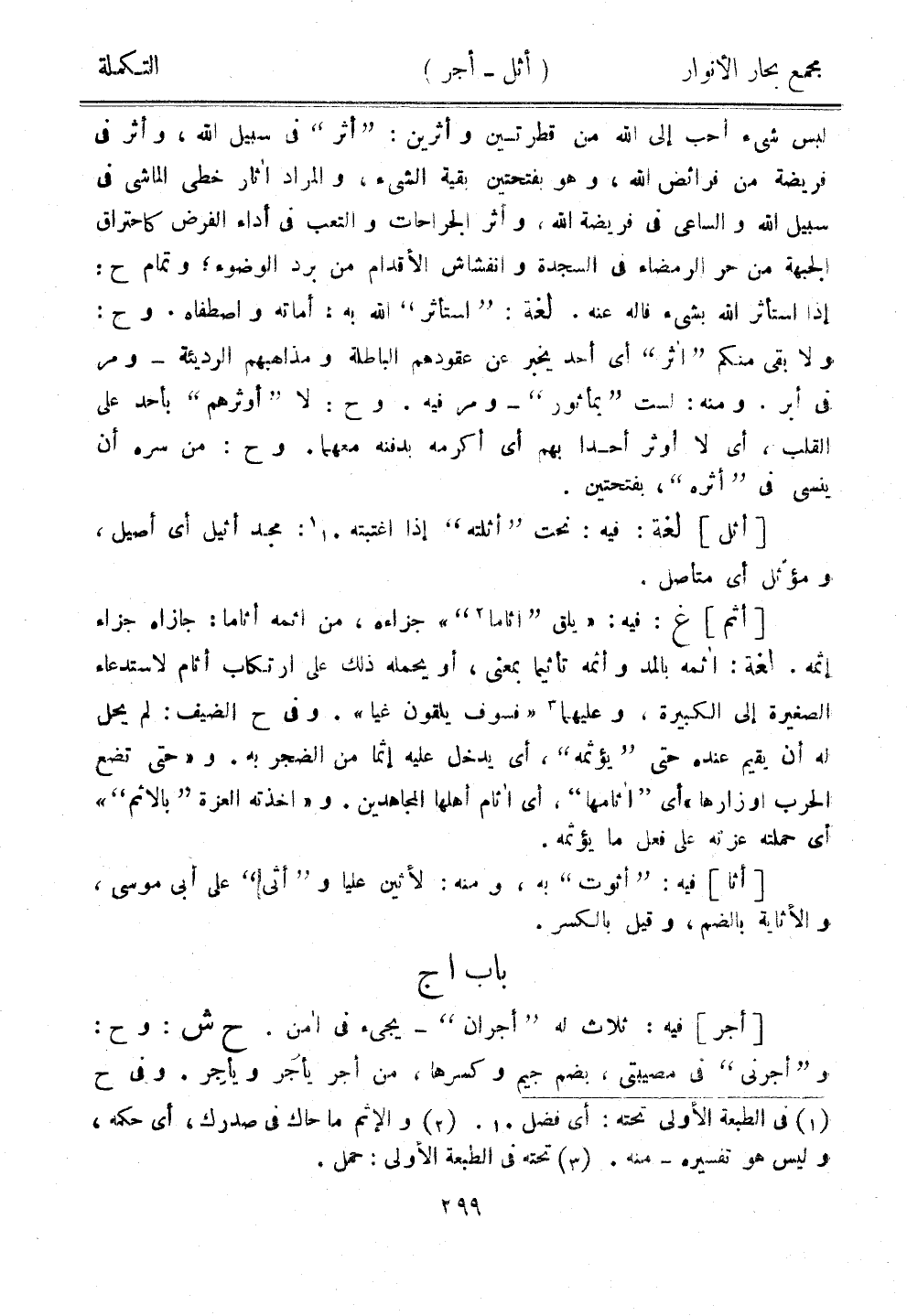 ليس شيء أحب إلى الله من قطرتين وأثرين: "أثر" في سبيل الله، وأثر في فريضة من فرائض من فرائض الله، وهو بفتحتين بقية الشيء، والمراد آثار خطى الماشي في سبيل الله والساعي في فريضة الله، وأثر الجراحات والتعب في أداء الفرض كاحتراق الجبهة من حر الرمضاء في السجدة وانفشاش الأقدام من برد الوضوء، وتمام ح: إذا استأثر الله بشيء فاله عنه. لغة: "استأثر" الله به: أماته واصطفاه. وح: ولا بقي منكم "أثر" أي أحد يخبر عن عقودهم الباطلة ومذاهبهم الرديئة - ومر في أبر. ومنه: لست "بمأثور" - ومر فيه. وح: لا "أوثرهم" بأحد على القلب، أي لا أوثر أحدًا بهم أي أكرمه بدفنه معهما. وح: من سره أن ينسى في "أثره"، بفتحتين.