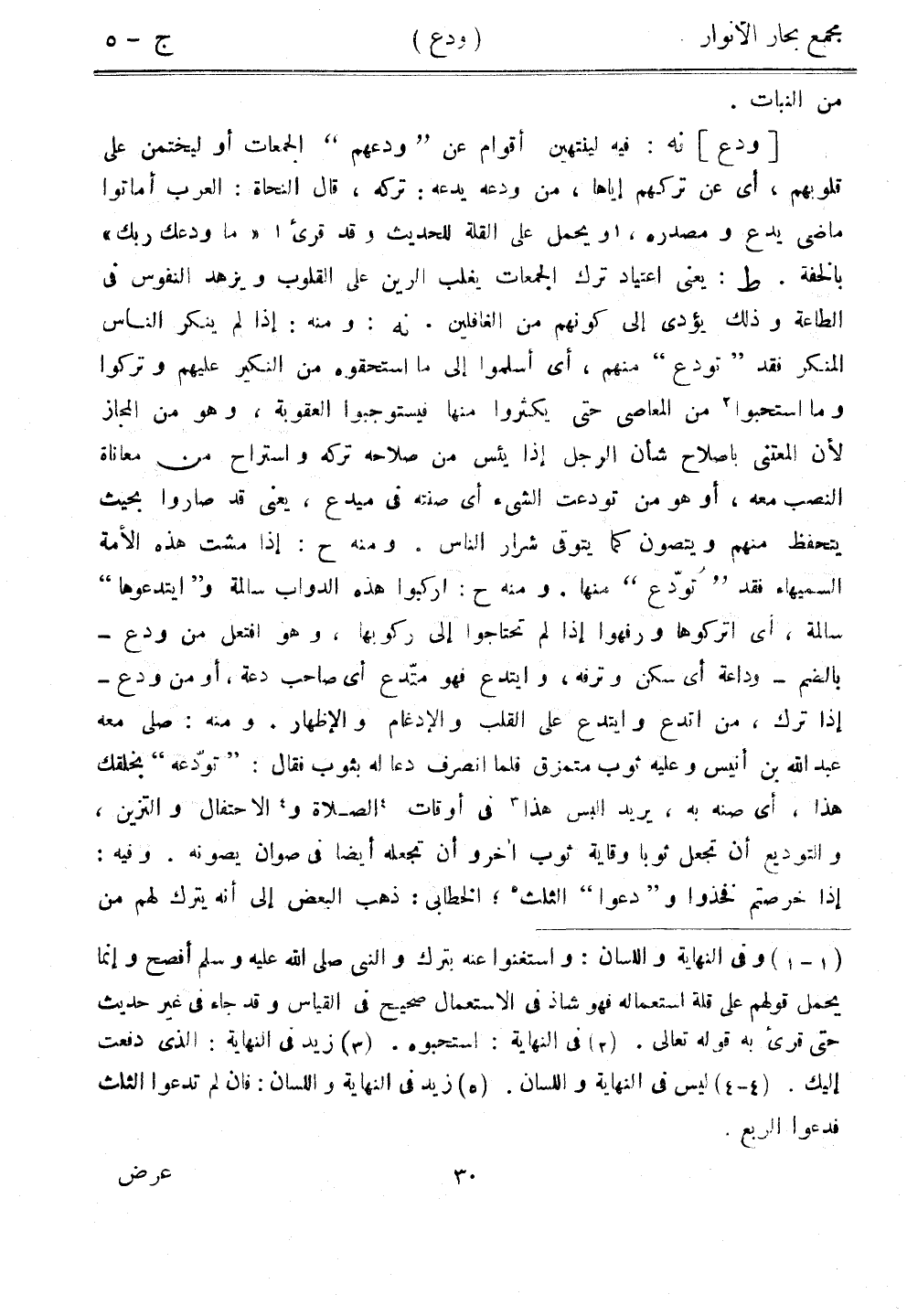 [ودع] نه: فيه لينتهين أقوام عن "ودعهم" الجمعات أو ليختمن على قلوبهم، أي عن تركهم إياها، من ودعه يدعه: تركه، قال النحاة: العرب أماتوا ماضي يدع ومصدره، ويحمل على القلة للحديث وقد قرئ "ما ودعك ربك" بالخفة. ط: يعني اعتياد ترك الجمعات يغلب الرين على القلوب ويزهد النفوس في الطاعة وذلك يؤدي إلى كونهم من الغافلين. نه: ومنه: إذا لم ينكر الناس المنكر فقد "تودع" منهم، أي أسلموا إلى ما استحقوه من النكير عليهم وتركوا وما استحبوا من المعاصي حتى يكثروا منها فيستوجبوا العقوبة، وهو من المجاز لأن المعتني بإصلاح شأن الرجل إذا يئس من صلاحه تركه واستراح من معاناة النصب معه، أو هو من تودعت الشيء أي صنته في ميدع، يعني قد صاروا بحيث يتحفظ منهم ويتصون كما يتوقى شرار الناس. ومنه ح: إذا مشت هذه الأمة السميهاء فقد "تودع" منها. ومنه ح: اركبوا هذه الدواب سالمة و"ايتدعوها" سالمة، أي اتركوها ورفهوا إذا لم تحتاجوا إلى ركوبها، وهو افتعل من ودع - بالضم - وداعة أي سكن وترفه، وايتدع فهو متدع أي صاحب دعة، أو من ودع - إذا ترك، من اتدع وايتدع على القلب والإدغام والإظهار. ومنه: صلى معه عبد الله بن أنيس وعليه ثوب متمزق قلما انصرف دعا له بثوب فقال: "تودعه" بخلقك هذا، أي صنه به، يريد البس هذا في أوقات الصلاة والاحتفال والتزين، والتوديع أن تجعل ثوبا ًوقاية ثوب أخر وأن تجعله أيضًا في صوان يصونه. وفيه: إذا خرصتم فخذوا و"دعوا" الثلث"؛ الخطابي: ذهب البعض إلى أنه يترك لهم من