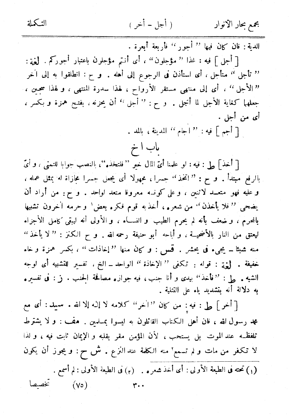 [أخذ] ط: فيه: لو علمنا أي المال خير "فنتخذه"، بالنصب جوابًا للتمني، وأيّ بالرفع مبتدأ. وح: "اتخذ" جسرًا، مجهولًا أي يجعل جسرًا مجازاة له بمثل عمله، وعليه فهو متعد لاثنين، وعلى كونه معروفًا متعد لواحد. وح: من أراد أن يضحي"فلا يأخذن" من شعره، أخذ به قوم فكره بعض وحرمه آخرون تشبيهًا بالمحرم، وضعف بأنه لم يحرم الطيب والنساء، والأولى أنه ليبقى كامل الأجزاء ليعتق من النار بالأضحية، وأباحه أبو حنيفة رحمه الله. وح الكنز: "لا يأخذ" منه شيئًا - يجيء في يحشر. قس: وكان منها "إخاذات"، بكسر همزة وخاء خفيفة. لغة: قوله: تكفي "الإخاذة" الواحد- إلخ، تفسير للتشبيه أي لوجه الشبه. ط: "فأخذ" بيدي وأنا جنب، فيه جوازه مصافحة الجنب. ز: في تفسيره به دلالة أنه بتشديد باء على التثنية.