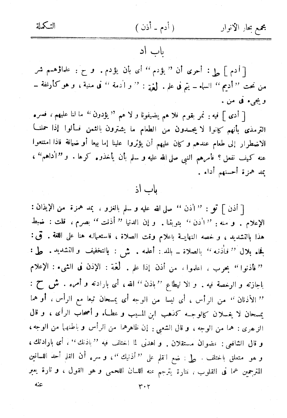 [أذن] تو: "أذن" صلى الله عليه وسلم بالغزو، بمد همزة من الإيذان: الإعلام. ومنه: "أذن" بتوبتنا. وإن الدنيا "أذنت" بصرم، قلت: ضبط هذا بالتشديد، وخصه النهاية بإعلام وقت الصلاة، فاستعماله هنا على اللغة. ق: فجاء بلال "فأذنه" بالصلاة - بالمد: أعلمه. ش: بالتخفيف والتشديد. ط: "فأذنوا" بحرب، اعلموا، من أذن إذا علم. لغة: الإذن في الشيء: الإعلام بإجازته والرخصة فيه. وإلا ليطاع "بإذن" الله، أي بإرادته وأمره. ش ح: "الأذنان" من الرأس، أي ليسا من الوجه أي يمسحان تبعًا مع الرأس، أو هما يمسحان لا يغسلان كالوجه مذهب ابن المسيب وعطاء وأصحاب الرأي، وقال الزهري: هما من الوجه، وقال الشعبي: إن ظاهرهما من الرأس وباطنهما من الوجه، وقال الشافعي: عضوان مستقلان. واهدني لما اختلف فيه "بإذنك"، أي بإرادتك، وهو متعلق باختلف. ط: ضع القلم على "أذنيك"، وسره أن القلم أحد اللسانين المترجمين عما في القلوب، فتارة يترجم عنه اللسان اللحمي وهو القول، وتارة يعبر