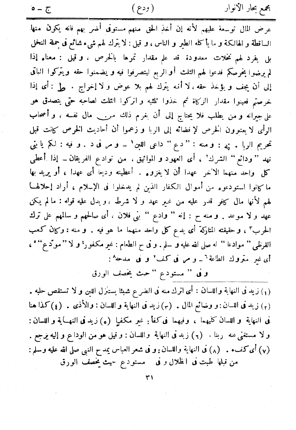عرض المال توسعة عليهم لأنه إن أخذ الحق منهم مستوفي أضر بهم فإنه يكون منها الساقطة والهالكة وما يأكله الطير والناس، وقيل: لا يترك لهم شيء شائع في جملة النخل بل يفرد لهم نخلات معدودة قد علم مقدار تمرها بالخرص، وقيل: معناه إذا لم يرضوا بخرصكم فدعوا لهم الثلث أو الربع ليتصرفوا فيه ويضمنوا حقه ويتركوا الباقي إلى أن يجف ويؤخذ حقه، لا أنه يترك لهم بلا عوض ولا إخراج. ط: أي إذا خرصتم فعينوا مقدار الزكاة ثم خذوا ثلثيه واتركوا الثلث لصاحبه حتى يتصدق هو على جيرانه ومن يطلب فلا يحتاج إلى أن يغرم ذلك من مال نفسه، وأصحاب الرأي لا يعتبرون الخرص لإفضائه إلى الربا وزعموا أن أحاديث الخرص كانت قبل تحريم الربا. نه: ومنه: "دع" داعي اللبن - ومر في د. وفيه: لكم يا بني نهد "ودائع" الشرك، أي العهود والمواثيق، من توادع الفريقان - إذا أعطى كل واحد منهما الآخر عهدًا أن لا يغزوه، أعطيته وديعًا أي عهدًا، أو يريد بها ما كانوا استودعوه من أموال الكفار الذين لم يدخلوا في الإسلام، أراد إحلالها لهم لأنها مال كافر قدر عليه من غير عهد ولا شرط، ويدل عليه قوله: ما لم يكن عه ولا موعد. ومنه ح: إنه "وادع" بني فلان، أي صالحهم وسالمهم على ترك الحرب، وحقيقته المتاركة أي يدع كل واحد منهما ما هو فيه. ومنه: وكان كعب القرظي "موادعا" له صلى الله عليه وسلم. وفي ح الطعام: غير مكفور ولا "مودع"، أي غير متروك الطاعة - ومر في كف وفي مدجه: