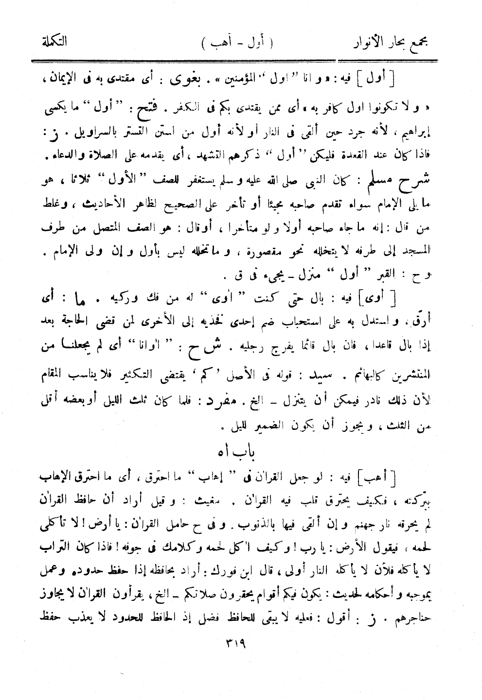 [أول] فيه: "وأنا "أول" المؤمنين". بغوي: أي مقتدي به في الإيمان، "ولا تكونوا أول كافر به" أي ممن يقتدي بكم في الكفر. فتح: "أول" ما يكسى إبراهيم، لأنه جرد حين ألقى في النار أو لأنه أول من استن التستر بالسراويل. ز: فإذا كان عند القعدة فليكن "أول" ذكرهم التشهد، أي يقدمه على الصلاة والدعاء. شرح مسلم: كان النبي صلى الله عليه وسلم يستغفر للصف "الأول" ثلاثًا، هو ما يلي الإمام سواء تقدم صاحبه مجيئًا أو تأخر على الصحيح لظاهر الأحاديث، وغلط من قال: إنه ما جاء صاحبه أولا ولو متأخرًا، أو قال: هو الصف المتصل من طرف المسجد إلى طرفه لا يتخلله نحو مقصورة، وما تخلله ليس بأول وإن ولى الإمام. وح: القبر "أول" منزل - يجيء في ق.