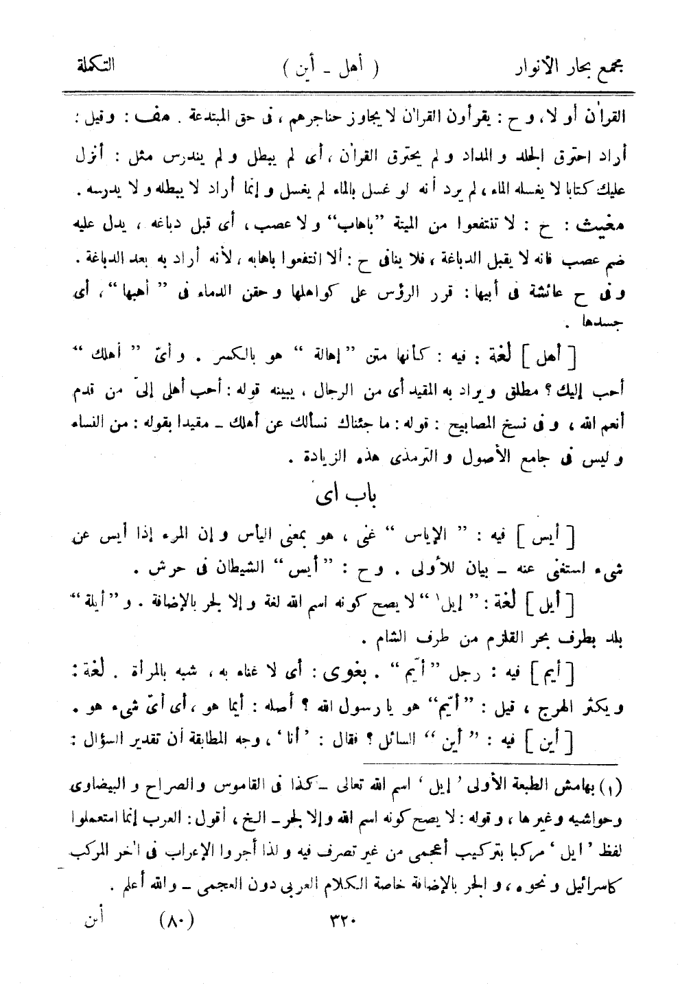 [أيل] لغة: "إيل" لا يصح كونه اسم اللغة لغة وإلا لجر بالإضافة. و"أيلة" بلد بطرف بحر القلزم من طرف الشام.
