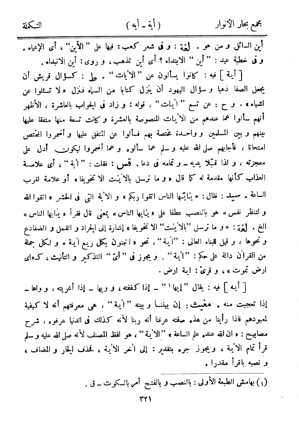 [أية] فيه: كانوا يسألون عن "الآيات". ط: كسؤال قريش أن يجعل الصفا ذهبا وسؤال اليهود أن ينزل كتابًا من السماء فنزل "لا تسئلوا عن أشياء". وح: عن تسع "آيات"، قوله: وزاد في الجواب بالعاشرة، الأظهر أنهم سألوا عما عندهم من الآيات المنصوصة بالعشرة وكانت تسعة منها متفقًا عليها بينهم وبين المسلمين وواحدة مختصة بهم فسألوا عن المتفق عليها وأضمروا المختص امتحانًا، فأجابهم صلى الله عليه وسلم عما سألوه وعما أضمروا ليكون أدل على معجزته، ولذا قبلا يديه - وتمامه في دعا. قس: فقلت: "أية"، أي علامة العذاب كأنها مقدمة له كما قال "وما نرسل بالآيات إلا تخويفًا" أو علامة لقرب الساعة. سيد: فقال: "يا أيها الناس اتقوا ربكم" والآية التي في الحشر "اتقوا الله ولتنظر نفس" هو بالنصب عطفًا على "يا أيها الناس" بمعنى قال فقرأ "يا أيها الناس" إلخ. لغة: "وما ترسل "بالآيات" إلا تخويفًا" إشارة إلى الجراد والقمل والضفادع ونحوها، وقيل للبناء العالي: "آية"، نحو "أتبنون بكل ريع آية" ولكل جملة من القرآن دالة على حكم: "آية". ويجوز في "آي" التذكير والتأنيث، كـ"أي أرض تموت" وقرئ: آية أرض.