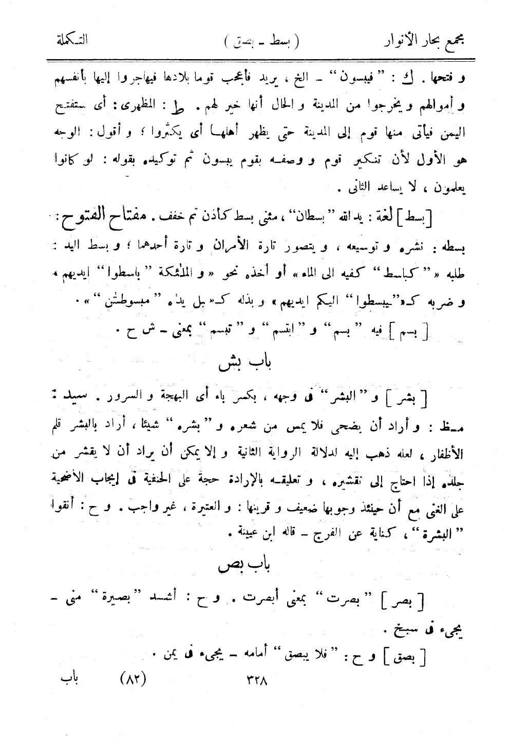 [بسط] لغة: يد الله "بسطان"، مثنى بسط كأن ثم خفف. مفتاح الفتوح: بسطه: نشره وتوسيعه، ويتصور تارة الأمران وتارة أحدهما، وبسط اليد: طلبه ""كباسط" كفيه إلى الماء" أو أخذه نحو "والملائكة "باسطوا" أيديهم" وضربه كـ"يبسطوا" إليكم أيديهم" وبذله كـ"بل يداه" مبسوطتان"".