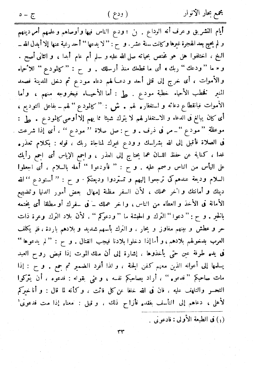 أيام التشريق وعرف أنه الوداع. ن: ودع الناس فيها وأوصاهم وعلمهم أمر دينهم ولم يحج بعد الهجرة غيرها وكانت سنة عشر. وح: "لا يدعها" أحد رغبة عنها إلا أبدل الله - إلخ، اختلفوا هل هو مختص بحياته صلى الله عليه وسلم أم عام أبدا، والثاني أصح. و"ما" "ودعك" ربك" أي ما قطعك منذ أرسلك. وح: "كالمودع" للأحياء والأموات، أي خرج إلى قتل أحد ودعا لهم دعاء مودع ثم دخل المدينة فصعد المنبر فخطب الأحياء خطبة مودع. ط: أما الأحياء فبخروجه منهم، وأما الأموات فبانقطاع دعائه واستغفاره لهم. ش: "كالمودع" لهم - بفاعل التوديع، أي كان يبالغ في الدعاء والاستغفار لهم لا يترك شيئًا مما يهم إلا أوصى كالمودع. ط: موعظة "مودع"- مر في ذرف. وح: صل صلاة "مودع"، أي إذا شرعت في الصلاة فأقبل إلى الله بشراسك وودع غيرك لمناجاة ربك، قوله: بكلام تعذره غدًا، كناية عن حفظ اللسان عما يحتاج إلى العذر، وأجمع الإياس أي أجمع رأيك على اليأس من الناس وصمم عليه. وح: "فأودعوا" أهله بالسلام، أي اجعلوا السلام وديعة عندهم كي ترجعوا إليهم وتستردوا وديعتكم. وح: "أستودع" الله دينك وأمانتك وآخر عملك، لأن السفر مظنة إمهال بعض أمور الدنيا وتضييع الأمانة في الأخذ والعطاء من الناس، وأخر عملك - في سفرك أو مطلقًا أي يختمه بالخير. وح: "دعوا" الترك والحبشة ما "ودعوكم"، لأن بلاد الترك وعرة ذات حر وعطش وبينهم مفاوز وبحار، والترك بأسهم شديد وبلادهم باردة، فلم يكلف العرب بدخولهم بلادهم، وأما إذا دخلوا بلادنا فيجب القتال. وح: "لم يدعوها" في يده طرفية عين حتى يأخذوها، إشارة إلى أن ملك الموت إذا قبض روح العبد يسلمها إلى أعوانه الذين معهم كفن الجنة، ولذا أفرد الضمير ثم جمع. وح: إذا مات صاحبكم "فدعوه"، أراد بصاحبكم نفسه، وعني بقوله: فدعوه، أن يتركوا التحسر والتلهف عليه، فإن في الله خلفًا عن كل فائت، وكأنه لما قال: وأنا خيركم لأهلي، دعاهم إلى التأسف بفقده فأزاح ذلك، وقيل: معناه إذا مت فدعوني