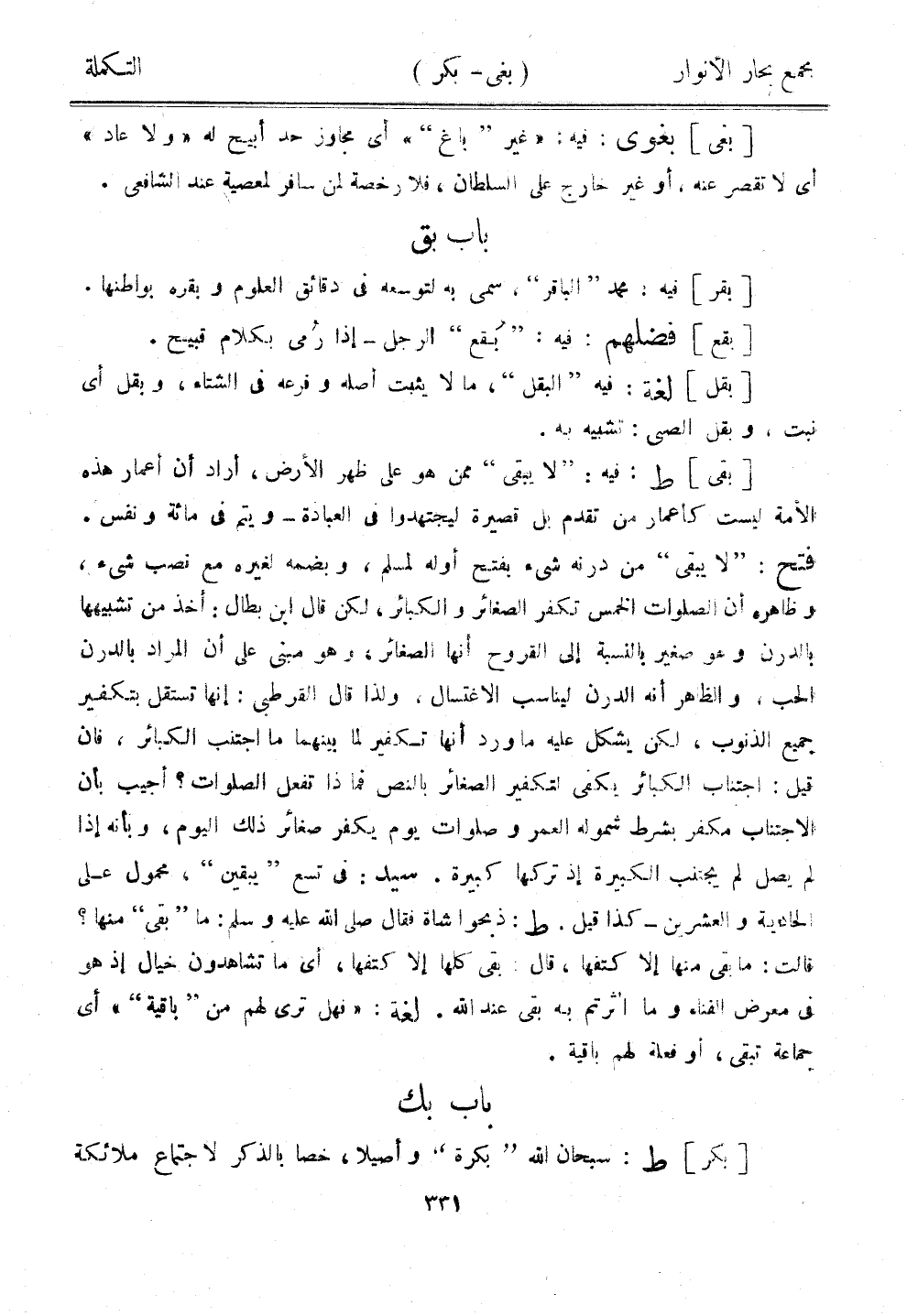 [بقى] ط: فيه: "لا يبقى" ممن هو على ظهر الأرض، أراد أن اعمار هذه الأمة ليست كأعمار من تقدم بل قصيرة ليجتهدوا في العبادة - ويتم في مائة ونفس. فتح: "لا يبقى" من درنه شيء بفتح أوله لمسلم، وبضمه لغيره مع نصب شيء، وظاهره أن الصلوات الخمس تكفر الصغار والكبائر، لكن قال ابن بطال: أخذ من تشبيهها بالدرن وهو صغير بالنسبة إلى القروح أنها الصغائر، وهو مبني على أن المراد بالدرن الحب، والظاهر أنه الدرن ليناسب الاغتسال، ولذا قال القرطبي: إنها تستقل بتكفير جميع الذنوب، لكن يشل عليه ما ورد أنها تكفير لما بينهما ما اجتنب الكبائر، فإن قيل: اجتناب الكبائر يكفي لتكفير الصغائر بالنص فماذا تفعل الصلوات؟ أجيب بأن الاجتناب مكفر بشرط شموله العمر وصلوات يوم يكفر صغائر ذلك اليوم، وبأنه إذا لم يصل لم يجتنب الكبيرة إذ تركها كبيرة. سيد: في تسع "يبقين"، محمول على الحادية والعشرين - كذا قيل. ط: ذبحوا شاة فقال صلى الله عليه وسلم: ما "بقي" منها؟ قالت: ما بقي منها إلا كتفها، قال: بقى كلها إلا كتفها، أي ما تشاهدون خيال إذ هو في معرض الفناء وما أثرتم به بقى عند الله. لغة: "فهل ترى لهم من "باقية"" أي جماعة تبقى، أو فعلة لهم باقية.