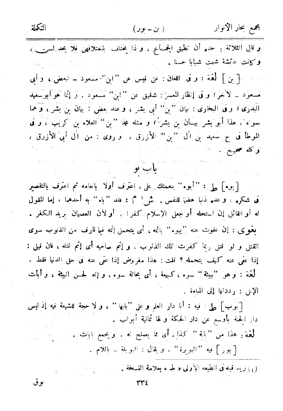 [بوء] ط "أبوء" بنعمتك على، اعترف أولا بإنعامه ثم اعترف بالتقصير في شكره، وعده ذنبًا هضمًا للنفس. ش م فقد "باء" به أحدهما، إما المقول له أو القائل إن استحله أو جعل الإسلام كفرًا، أو لأن العصيان يريد الكفر. بغوي: إن عفوت عنه "يبوء" بإثمه، أي يتحمل إثمه فيما قارف من الذنوب سوى القتل ولو قتل ربما كفرت تلك الذنوب، وإثم صاحبه أي إثم قتله، فإن قيل: إذا عفى عنه كيف يتحمله؟ قلت: هذا مفروض إذا عفى عنه في حق الدنيا فقط. لغة: وهو "ببيئة" سوء، كبيعة، أي بحالة سوء، وإنه لحسن البيئة، وأبأت الإبل: رددتها إلى المباءة.