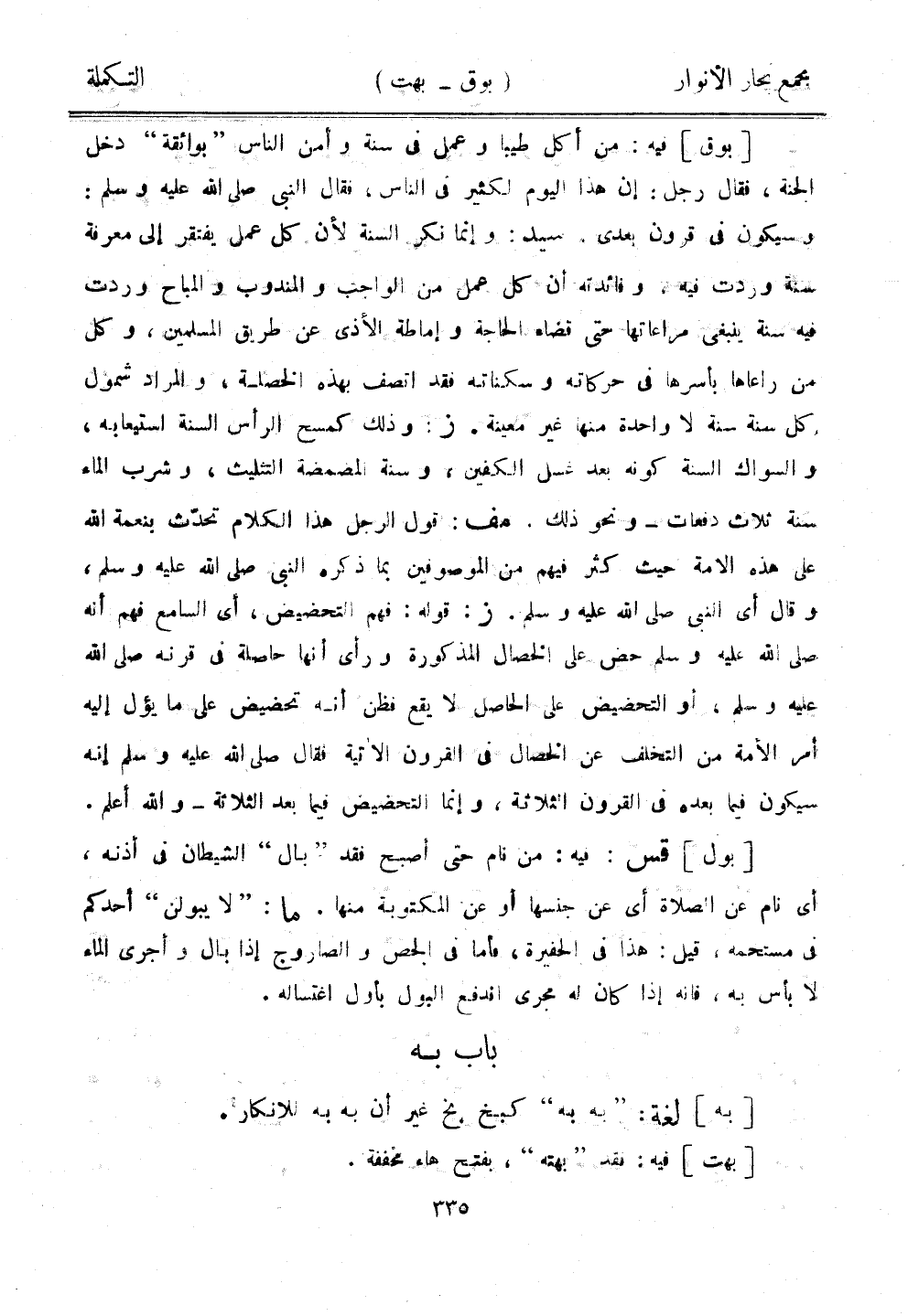 [بول] قس: فيه من نام حتى أصبح فقد "بال" الشيطان في أذنه، أي نام عن الصلاة أي عن جنسها أو عن المكتوبة منها. ما: "لا يبولن" أحدكم في مستحمه، قيل: هذا في الحفيرة، فأما في الجص والصاروج إذا بال وأجرى الماء لا بأس به، فإنه إذا كان له مجرى فادفع البول بأول اغتساله.