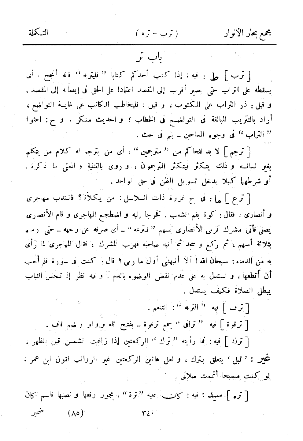 [ترع] ما: في ح غزوة ذات السلاسل: من يكلانا؟ فانتدب مهاجري وأنصاري، فقال: كونا بفم الشعب. فخرجا إليه واضطجع المهاجري وقام الأنصاري يصلي فأتى مشرك فرمى الأنصاري بسهم "فترعه" - أي صرفه عن وجهه - حتى رماه بثلاثة أسهم، ثم ركع وسجد ثم أنبه صاحبه فهرب المشرك، فقال المهاجري لما رأى به من الدماء: سبحان الله! ألا أنبهتني أول ما رمى؟ قال: كنت في سورة فلم أحب أن أقطعها، واستدل به على عدم نقض الوضوء بالدم، وفيه نظر غذ تنجس الثياب يبطل الصلاة فكيف يستدل.