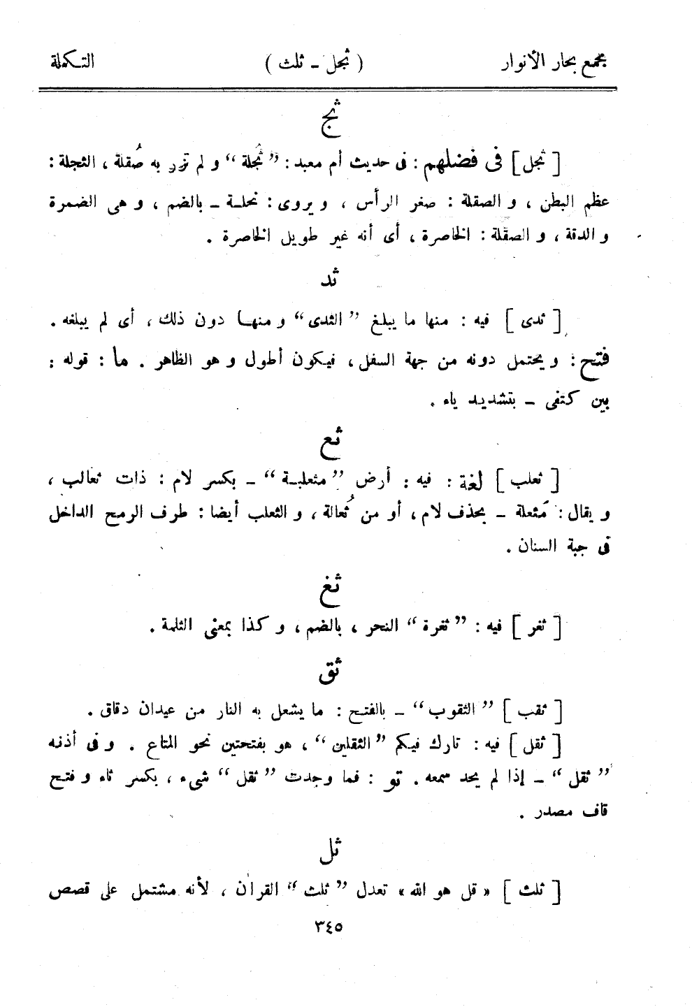 [ثجل] في فضلهم في حديث أم معبد: "ثجلة" ولم تزر به صُقلة، الثجلة: عظم البطن، والصقلة: صغر الرأس، ويروى: نحلة -بالضم، وهي الضمرة والدقة، والصقلة: الخاصرة، أي أنه غير طويل الخاصرة.