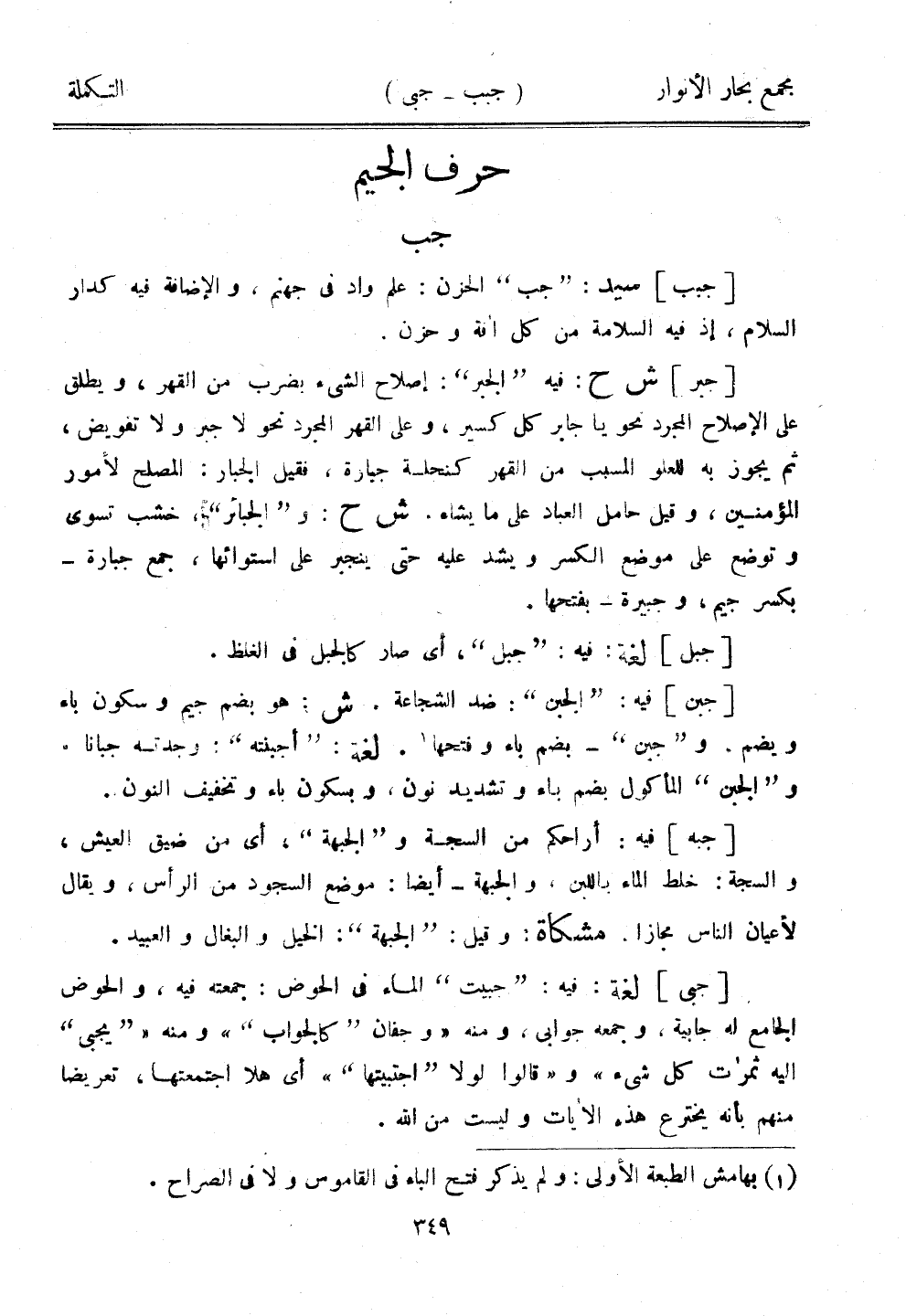[جبي] لغة: فيه: "جبيت" الماء في الحوض: جمعته فيه، والحوض الجامع له جابية، وجمعه جوابين ومنه "وجفان "كالجواب"" ومنه ""يجيء" إليه ثمرات كل شيء" و"قالوا لولا "اجتبيتها"" أي هلا اجتمعتها، تعريضًا منهم بأنه يخترع هذه الآيات وليست من الله.