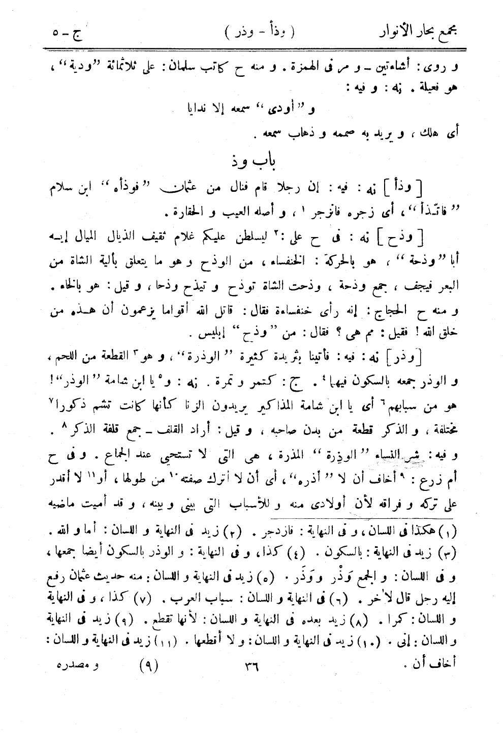 [وذر] نه: فيه: فأتينا بثريدة كثيرة "الوذرة"، وهو القطعة من اللحم، والوذر جمعه بالسكون فيهما. ج: كتمر وتمرة. نه: ويا ابن شامة "الوذر"! هو من سبابهم أي يا ابن شامة المذاكير يريدون الزنا كأنها كانت تشم ذكورا مختلفة، والذكر قطعة من بدن صاحبه، وقيل: أراد القلف - جمع قلفة الذكر. وفيه: شر النساء "الوذرة" المذرة، هي التي لا تستحي عند الجماع. وفي ح أم زرع: أخاف أن لا "أذره"، أي أن لا أترك صفته من طولها، أو لا أقدر على تركه وفراقه لأن أولادي منه وللأسباب التي بيني وبينه، وقد أميت ماضيه