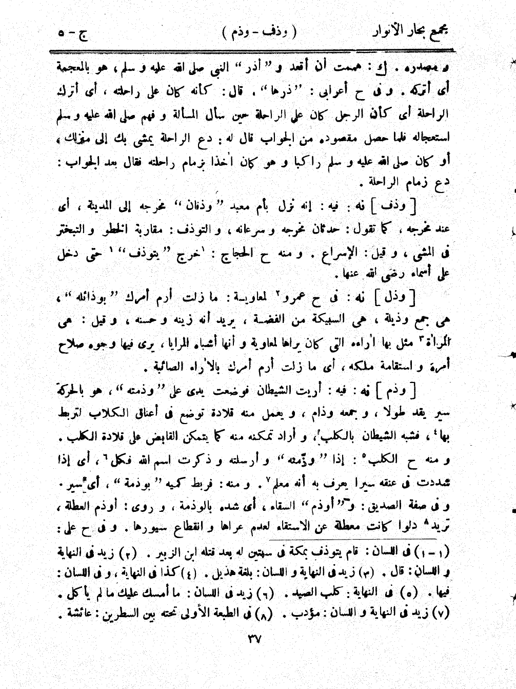 [وذم] نه: فيه: أريت الشيطان فوضعت يدي على "وذمته"، هو بالحركة سير يقد طولا، وجمعه وذام، ويعمل منه قلادة توضع في أعناق الكلاب لتربط بها، فشبه الشيطان بالكلب، وأراد تمكنه منه كما يتمكن القابض على قلادة الكلب. ومنه ح الكلب: إذا "وذمته" وأرسلته وذكرت اسم الله فكل، أي إذا شددت في عنقه سيرًا يعرف به أنه معلم. ومنه: فربط كميه "بوذمة"، أي سير. وفي صفة الصديق: و"أوذم" السقاء، أي شده بالوذمة، وروي: أوذم العطلة، تريد دلوا كانت معطلة عن الاستقاء لعدم عراها وانقطاع سيورها. وفي ح علي: