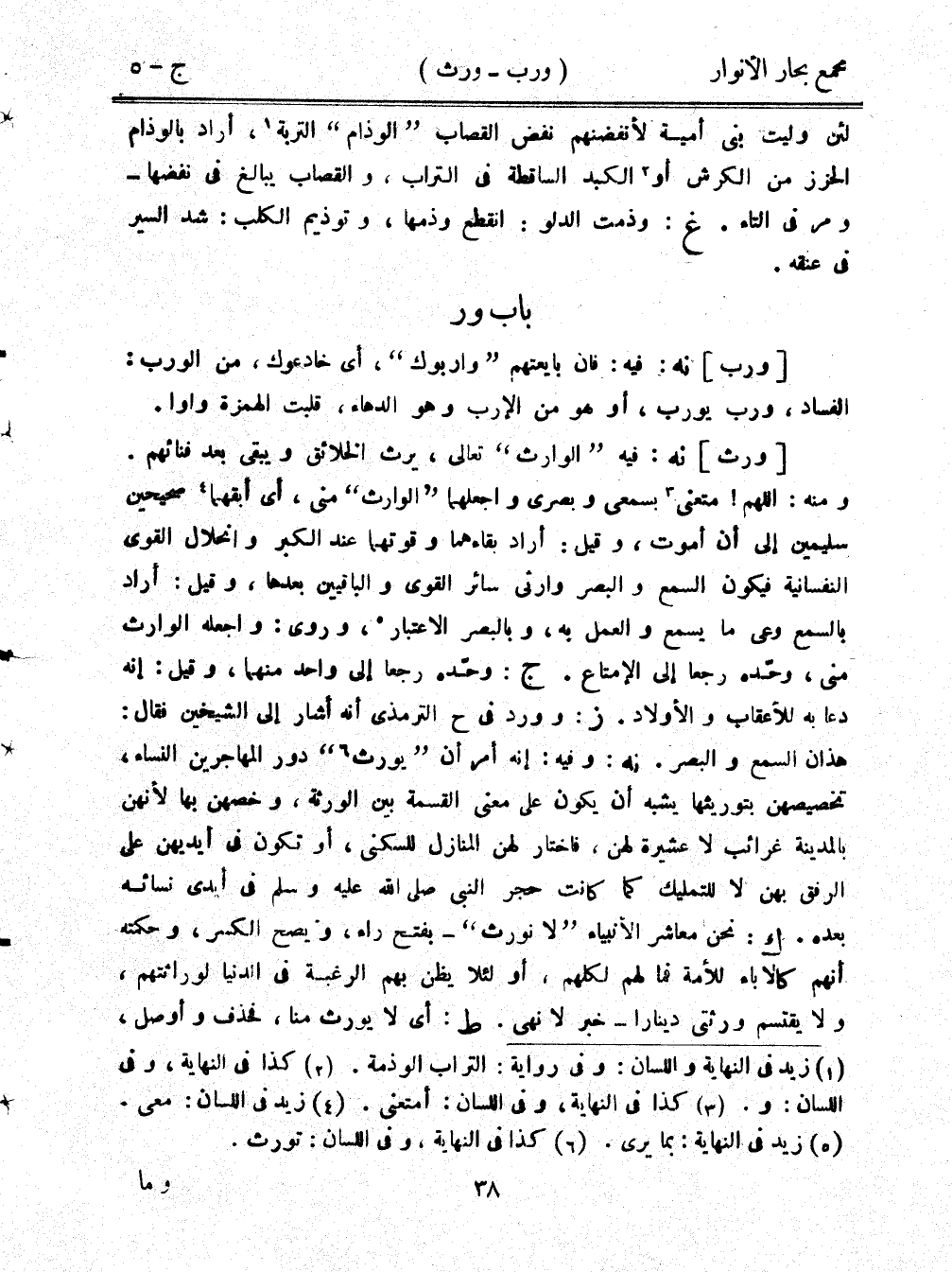[ورث] نه: فيه "الوارث" تعالى، يرث الخلائق ويبقى بعد فنائهم. ومنه: اللهم! متعني بسمعي وبصري واجعلهما "الوارث" مني، أي أبقهما صحيحين سليمين إلى أن أموت، وقيل: أراد بقاءهما وقوتهما عند الكبر وانحلال القوى النفسانية فيكون السمع والبصر وارثي سائر القوى والباقين بعدها، وقيل: أراد بالسمع وعى ما يسمع والعمل به، وبالبصر الاعتبار، وروي: واجعله الوارث مني، وحده رجعا إلى الإمتاع. ج: وحده رجعا إلى واحد منهما، وقيل: إنه دعا به للأعقاب والأولاد. ز: وورد في ح الترمذي أنه أشار إلى الشيخين فقال: هذان السمع والبصر. نه: وفيه: إنه أمر أن "يورث" دور المهاجرين النساء، تخصيصهن بتوريثها يشبه أن يكون على معنى القسمة بين الورثة، وخصهن بها لأنهن بالمدينة غرائب لا عشيرة لهن، فاختار لهن المنازل للسكنى، أو تكون في أيديهن على الرفق بهن لا للتمليك ما كانت حجر النبي صلى الله عليه وسلم في أيديهن على الرفق بهن لا للتمليك كما كانت حجر النبي صلى الله عليه وسلم في أيدي نسائه بعده.: نحن معاشر الأنبياء "لا نورث" - بفتح راء، ويصح الكسر، وحكمته أنهم كالآباء للأمة فما لهم لكلهم، أو لئلا يظن بهم الرغبة في الدنيا لوراثتهم، ولا يقتسم ورثتي دينارًا - خبر لا نهي. ط: أي لا يورث منا، فحذف وأوصل،