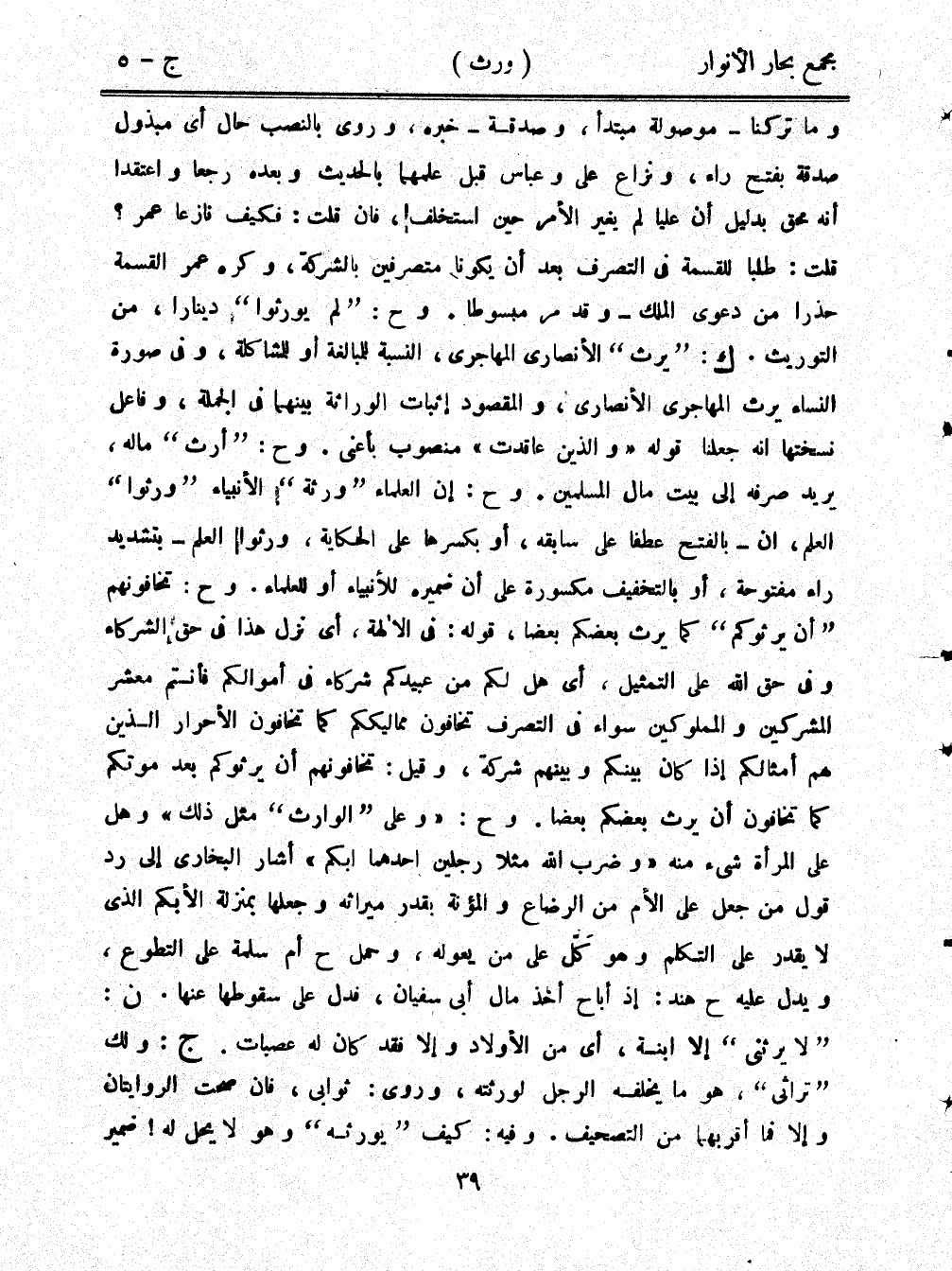 وما تركنا - موصولة مبتدأ، وصدقة - خبره، وروى بالنصب حال أي مبذول صدقة بفتح راء، ونزاع على وعباس قبل علمهما بالحديث وبعده رجعا واعتقدا أنه محق بدليل أن عليا لم يغير الأمر حين استخلف، فإن قلت: فكيف نازعا عمر؟ قلت: طلبا للقسمة في التصرف بعد أن يكونا متصرفين بالشركة، وكره عمر القسمة حذرًا من دعوى الملك - وقد مر مبسوطًا. وح: "لم يورثوا" دينارًا، من التوريث. ك: "يرث" الأنصاري المهاجري، النسبة للمبالغة أو للمشاكلة، وفي صورة النساء يرث المهاجري الأنصاري، والمقصود إثبات الوراثة بينهما في الجملة، وفاعل نسختها أنه جعلنا قوله "والذين عاقدت" منصوب بأعني. وح: "أرث" ماله، يريد صرفه إلى بيت مال المسلمين. وح: إن العلماء "ورثة" الأنبياء "ورثوا" العلم، أن - بالفتح عطفًا على سابقه، أو بكسرها على الحكاية، ورثوا العلم - بتشديد راء مفتوحة، أو بالتخفيف مكسورة على أن ضميره للأنبياء أو للعلماء. وح: تخافونهم "أن يرثوكم" كما يرث بعضكم بعضا، قوله: في الآلهة، أي نزل هذا في حق الشركاء وفي حق الله على التمثيل، أي هل لكم من عبيدكم شركاء في أموالكم فأنتم معشر المشركين والمملوكين سواء في التصرف تخافون مماليككم كما تخافون الأحرار الذين هم أمثالكم إذا كان بينكم وبينهم شركة، وقيل: تخافونهم أن يرثوكم بعد موتكم كما تخافون أن يرث بعضكم بعضًا. وح: "وعلى "الوارث" مثل ذلك" وهل على المرأة شيء منه "وضرب الله مثلًا رجلين أحدهما أبكم" أشار البخاري إلى رد قول من جعل على الأم من الرضاع والمؤنة بقدر ميراثه وجعلها بمنزلة الأبكم الذي لا يقدر على التكلم وهو كل على من يعوله، وحمل ح أم سلمة على التطوع، ويدل عليه ح هند: إذ أباح أخذ مال أبي سفيان، فدل على سقوطها عنها. ن: "لا يرثني" إلا ابنة، أي من الأولاد وإلا فقد كان له عصبات. ج: ولك "تراثي"، هو ما يخلفه الرجل لورثته، وروي: ثوابي، فإن صحت الروايتان وألا فما أقربهما من التصحيف. وفيه: كيف "يورثه" وهو لا يحل له! ضمير