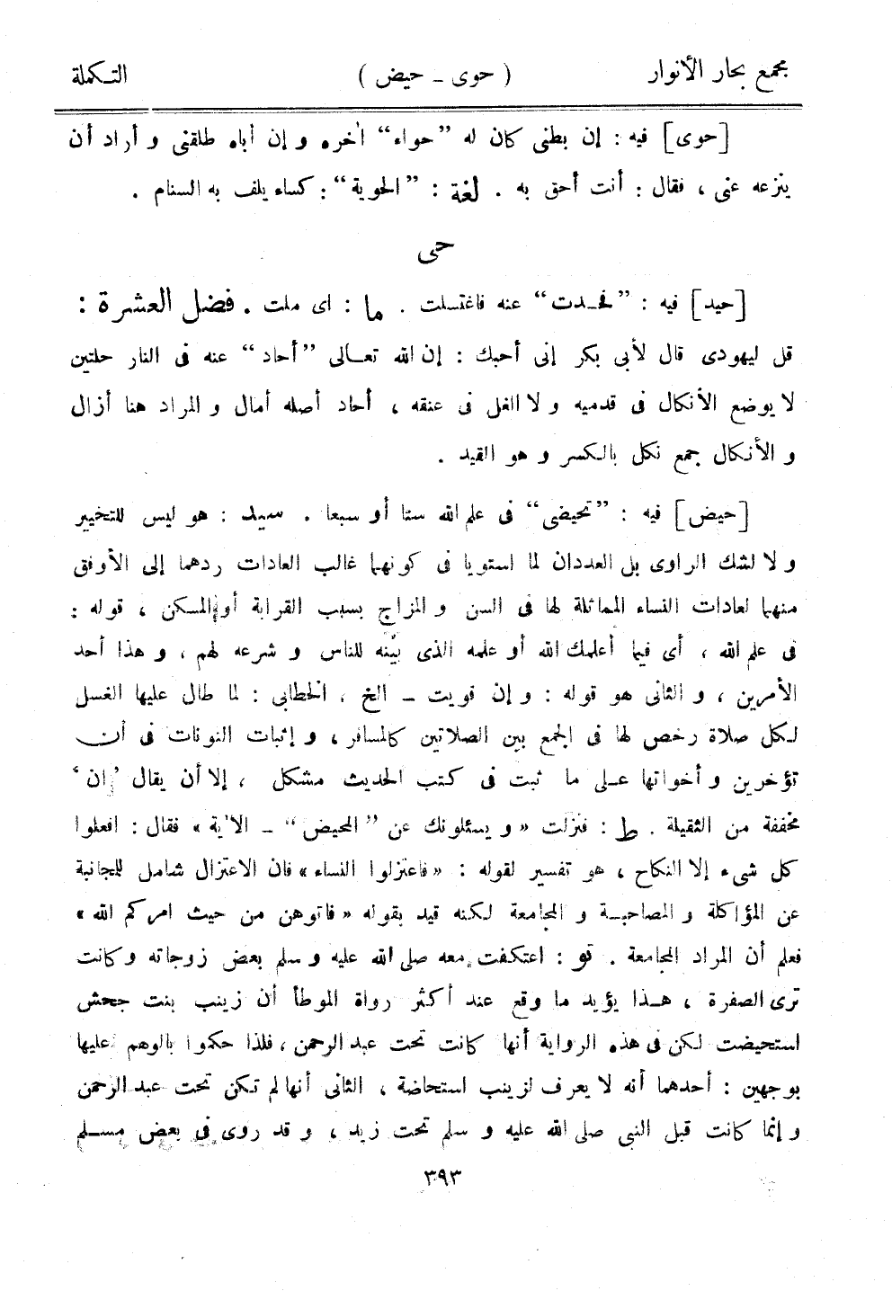 [حيض] فيه: "تحيضي" في علم الله ستًا أو سبعًا. سيد: هو ليس للتخيير ولا لشك الراوي بل العددان لما استويا في كونهما غالب العادات ردهما إلى الأوفق منهما لعادات النساء المماثلة لها في السن والمزاج بسبب القرابة أو المسكن، قوله: في علم الله، أي فيما أعلمك الله أو علمه الذي بينه للناس وشرعه لهم، وهذا أحد الأمرين، والثاني هو قوله: وإن قويت - إلخ، الخطابي: لما طال عليها الغسل لكل صلاة رخص لها في الجمع بين الصلاتين كالمسافر، وإثبات النونات في أن تؤخرين وأخواتها على ما ثبت في كتب الحديث مشكل، إلا أن يقال "أن" مخففة من الثقيلة. ط: فنزلت "ويسئلونك عن "المحيض" - الآية" فقال: افعلوا كل شيء إلا النكاح، هو تفسير لقوله: "فاعتزلوا النساء" فإن الاعتزال شامل للمجانبة عن المؤاكلة والمصاحبة والمجامعة لكنه قيد بقوله "فأتوهن من حيث أمركم الله" فعلم أن المراد المجامعة. تو: اعتكفت معه صلى الله عليه وسلم بعض زوجاته وكانت ترى الصفرة، هذا يؤيد ما وقع عند أكثر رواة الموطأ أن زينب بنت جحش استحيضت لكن في هذه الرواية أنها كانت تحت عبد الرحمن، فلذا حكموا بالوهم عليها بوجهين: أحدهما أنه لا ييعرف لزينب استحاضة، الثاني أنها لم تكن تحت عبد الرحمن وإنما كانت قبل النبي صلى الله عليه وسلم تحت زيد، وقد روى في بعض مسلم