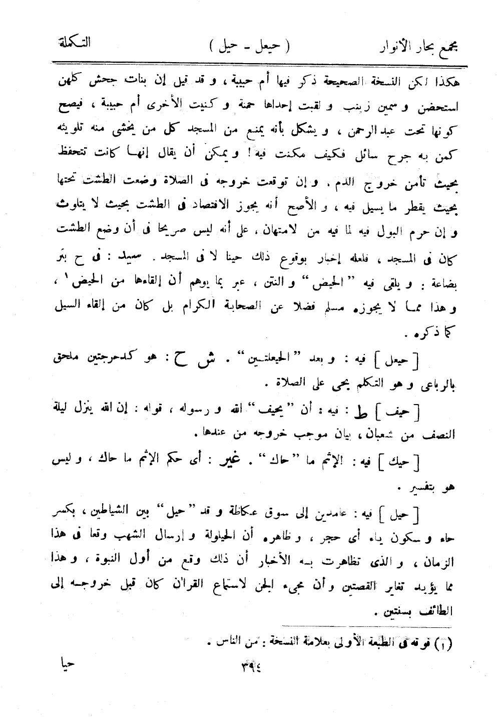 هكذا لكن النسخة الصحيحة ذكر فيها أم حبيبة، وقد قيل إن بنات جحش كلهن استحضن وسمين زينب ولقبت إحداها حمنة وكنيت الأخرى أم حبيبة، فيصح كونها تحت عبد الرحمن، ويشكل بأنه يمنع من المسجد كل من يخشى منه تلويثه كمن به جرح سائل فكيف مكنت فيه! ويمكن أن يقال إنها كانت تتحفظ بحيث تأمن خروج الدم. وإن توقعت خروجه في الصلاة وضعت الطشت تحتها بحيث يقطر ما يسيل فيه، والأصح أنه يجوز الاقتصاد في الطشت بحيث لا يتلوث ون حرم البول فيه لما فيه من لامتهان، على أنه ليس صريحًا في أن وضع الطشت كان في المسجد، فلعله إخبار بوقوع ذلك حينًا لا في المسجد. سيد: في ح بئر بضاعة: ويلقى فيه "الحيض" والنتن، عبر بما يوهم أن إلقاءها من الحيض، وهذا مما لا يجوزه مسلم فضلا عن الصحابة الكرام بل كان من إلقاء السيل كما ذكره.
