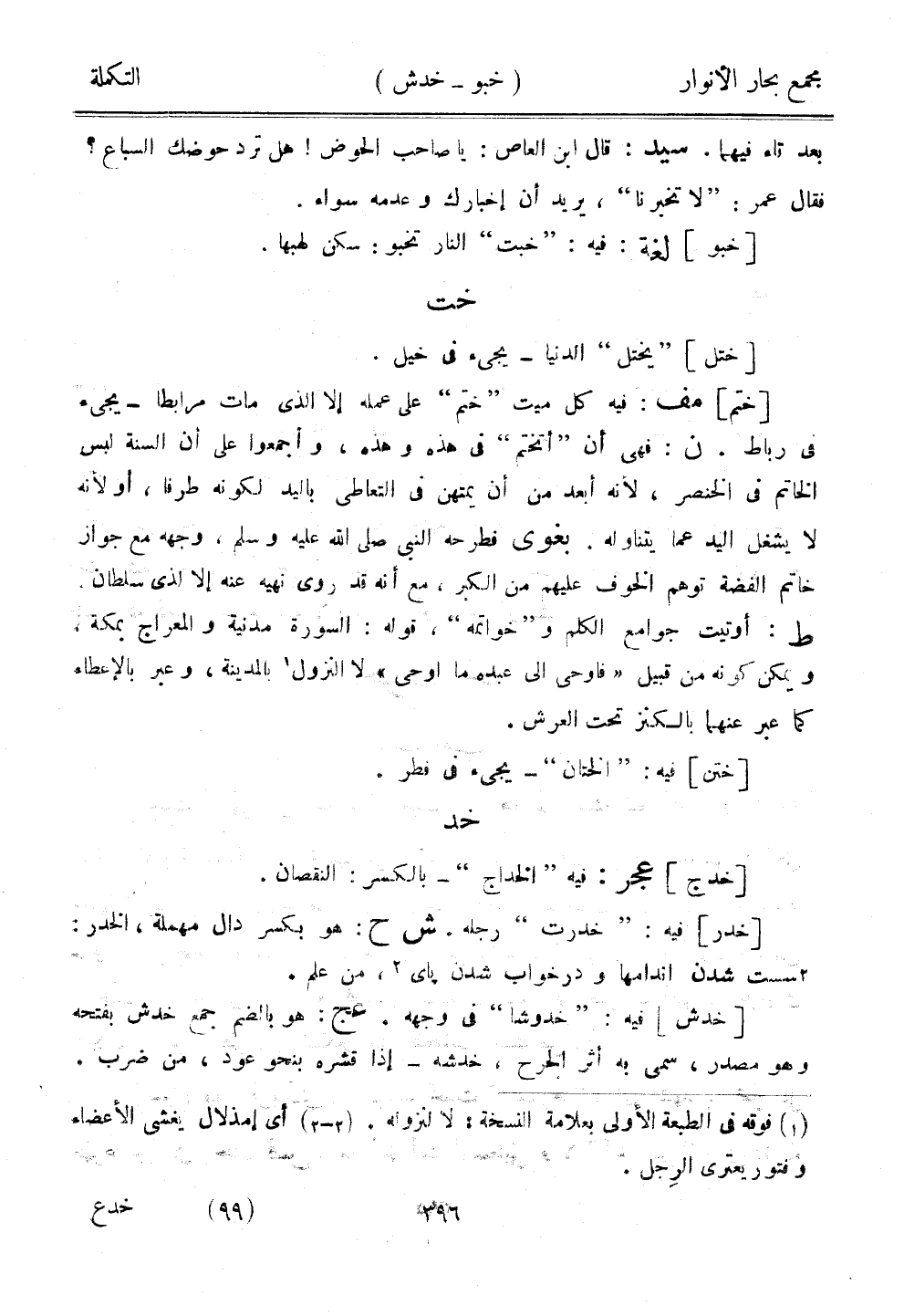 [ختم] مف: فيه كل ميت "ختم" على عمله إلا الذي مات مرابطًا - يجيء في رباط. ن: فهي أن "أتختم" في هذه وهذه، وأجمعوا على أن السنة لبس الخاتم في الخنصر، لأنه أبعد من أن يمتهن في التعاطي باليد لكونه طرفًا، أو لأنه لا يشغل اليد عما يتناوله. بغوي فطرحه النبي صلى الله عليه وسلم، وجهه مع جواز خاتم الفضة توهم الخوف عليهم من الكبر، مع أنه قد روى نهيه عنه إلا لذي سلطان. ط: أوتيت جوامع الكلم و"خواتمه"، قوله: السورة مدنية والمعراج بمكة، ويمكن ونه من قبيل "فأوحى إلى عبده ما أوحي" لا النزول بالمدينة، وعبر بالإعطاء كما عبر عنهما بالكنز تحت العرش.