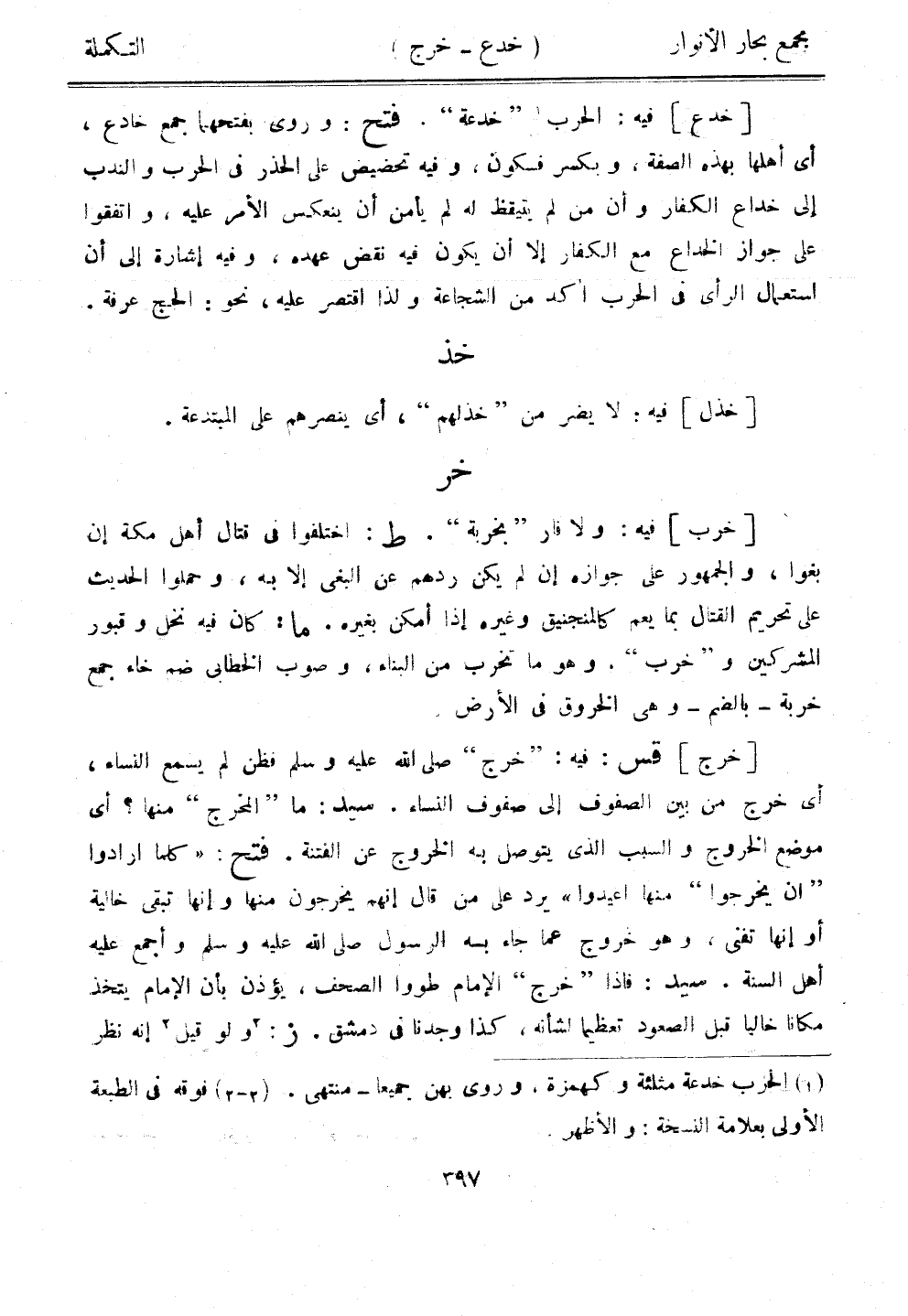 [خرج] قس: فيه: "خرج" صلى الله عليه وسلم فظن لم يسمع النساء، أي خرج من بين الصفوف إلى صفوف النساء. سيد: ما "المخرج" منها؟ أي موضع الخروج والسبب الذي يتوصل به الخروج عن الفتنة. فتح: "كلما أرادوا "أن يخرجوا" منها أعيدوا" يرد على من قال إنهم يخرجون منها وإنها تبقى خالية أو أنها تفنى، وهو خروج عما جاء به الرسول صلى الله عليه وسلم وأجمع عليه أهل السنة. سيد: فإذا "خرج" الإمام طووا الصحف، يؤذن بأن الإمام يتخذ مكانًا خاليًا قبل الصعود تعظيمًا لشأنه، كذا وجدنا في دمشق. ز: ولو قيل إنه نظر