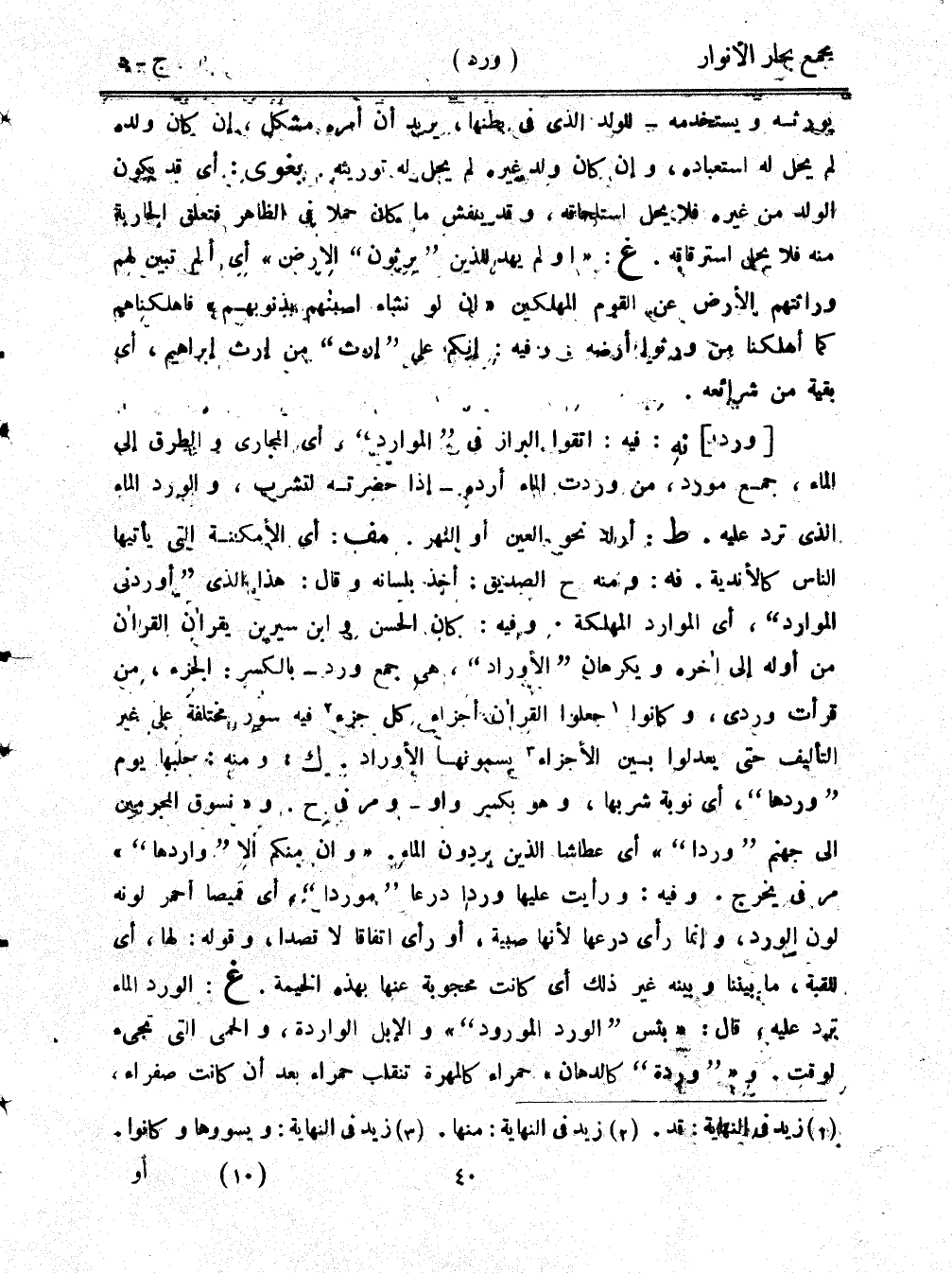 [ورد] نه: فيه اتقوا البراز في "الموارد" أي المجاري والطرق إلى الماء، جمع مورد، من وردت الماء أرده - إذا حضرته لتشرب، والورد الماء الذي ترد عليه. ط: أراد نحو العين أو النهر. مف: أي الأمكنة التي يأتيها الناس كالأندية. نه: ومنه ح الصديق: أخذ بلسانه وقال: هذا الذي "أوردني الموارد"، أي الموارد المهلكة. وفيه: كان الحسن وابن سيرين يقران القرآن من أوله إلى آخره ويكرهان "الأوراد"، هي جمع ورد - بالكسر: الجزء، من قرأت وردي، وكانوا جعلوا القرآن أجزاء كل جزء فيه سور مختلفة على غير التأليف حتى يعدلوا بسين الأجزاء يسمونها الأوراد. ك: ومنه: جعلها يوم "وردها"، أي نوبة شربها، وهو بكسر واو - ومر في ح. و"نسوق المجرمين إلى جهنم "وردا"" أي عطاشا الذين يردون الماء. "وأن منكم ألا "واردها"" مر في يخرج. وفيه: ورأيت عليها وردا درعا "موردا" أي قميصًا أحمر لونه لون الورد، وإنما رأى درعها لأنها صبية، أو رأى اتفاقًا لا قصدا، وقوله: لها، أي للقبة، ما بيننا وبينه غير ذلك أي كانت محجوبة عنها بهذه الخيمة. غ: الورد الماء برد عليه، قال: "بئس "الورد المورود"" والإبل الواردة، والحمى التي تجيء لوقت. و""وردة" كالدهان" حمراء كالمهرة تنقلب حمراء بعد أن كانت صفراء،