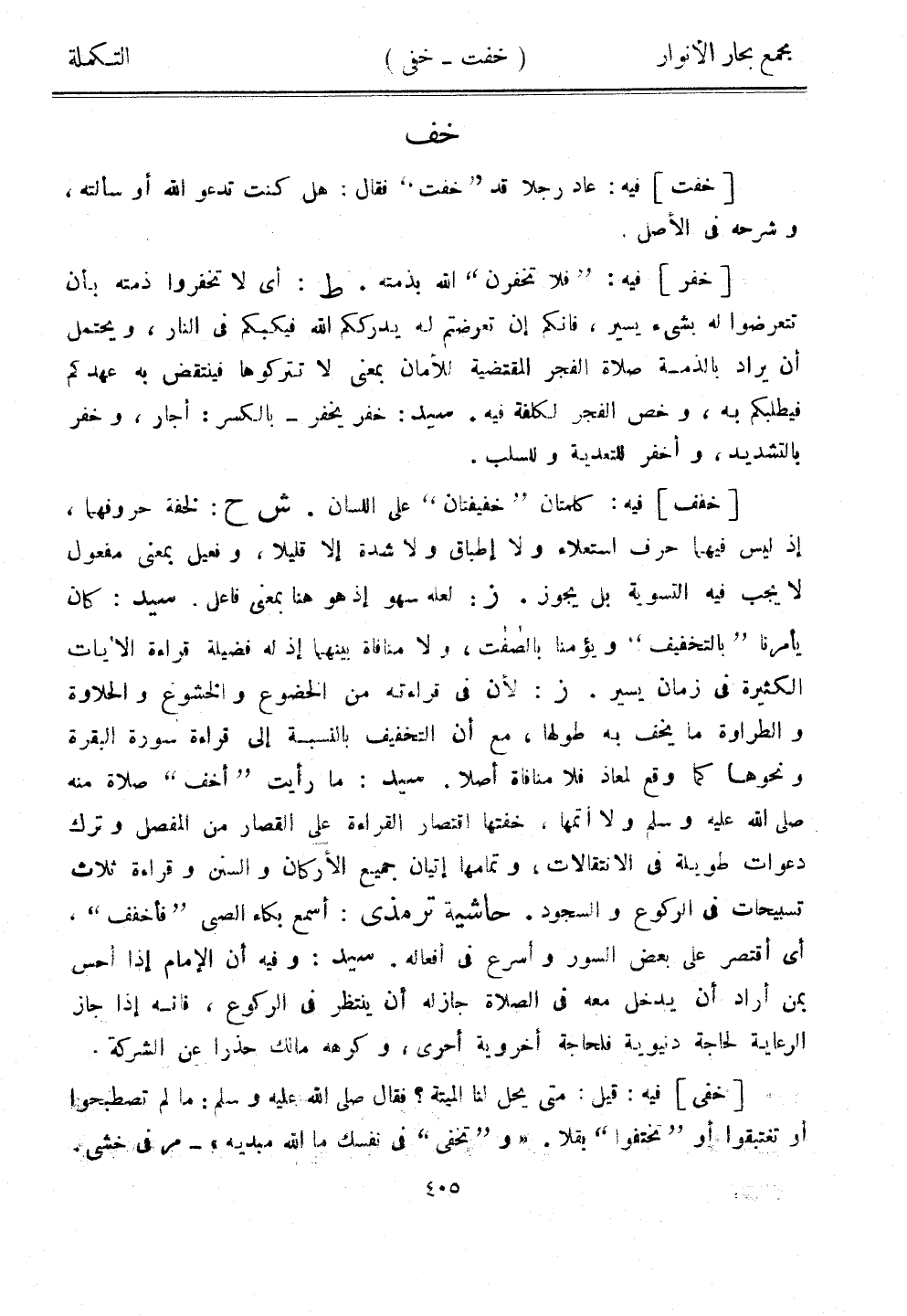 [خفف] فيه: كلمتان "خفيفتان" على اللسان. ش ح: لخفة حروفهما، إذ ليس فيهما حرف استعلاء ولا إطباق ولا شدة إلا قليلا، وفعيل بمعنى مفعول لا يجب فيه التسوية بل يجوز. ز: لعله سهو إذ هو هنا بمعنى فاعل. سيد: كان يأمرنا "بالتخفيف" ويؤمنا بالصافات، ولا منافاة بينهما إذ له فضيلة قراءة الآيات الكثيرة في زمان يسير. ز: لأن في قراءته من الخضوع والخشوع والحلاوة والطراوة ما يخف به طولها، مع أن التخفيف بالنسبة إلى قراءة سورة البقرة ونحوها كما وقع لمعاذ فلا منافاة أصلا. سيد: ما رأيت "أخف" صلاة منه صلى الله عليه وسلم ولا أتمها، خفتها اقتصار القراءة على القصار من المفصل وترك دعوات طويلة في الانتقالات، وتمامها إتيان جميع الأركان والسنن وقراءة ثلاث تسبيحات في الركوع والسجود. حاشية ترمذي: أسمع بكاء الصبي "فأخفف". أي أقتصر على بعض السور وأسرع في أفعاله. سيد: وفيه أن الإمام إذا أحس بمن أراد أن يدخل معه في الصلاة جاز له أن ينتظر في الركوع، فإنه إذا جاز الرعاية لحاجة دنيوية فلحاجة أخروية أحرى، كرهه مال حذرًا عن الشركة.