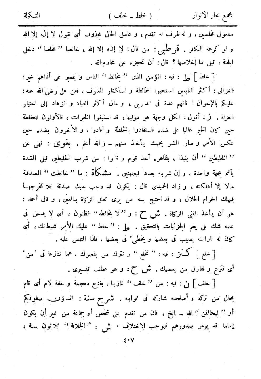 [خلط] ط: فيه: المؤمن الذي "يخالط" الناس ويصبر على أذاهم خير؛ الغزالي: أكثر التابعين استحبوا المخالطة واستكثار المعارف، فعن علي رضي الله عنه: عليكم بالإخوان! فإنهم عدة في الدارين، ومال أكثر العباد والزهاد إلى اختيار العزلة. ز: أقول: لكل وجهة هو موليها، قد استبقوا الخيرات، فالأولون للخلطة حين كان الخير غالبًا على ضده فاستفادوا بالخلطة وأفادوا، والآخرون بضده حين عكس الأمر وصار الشر بحيث يأخذ منهم - والله أعلم. بغوى: نهى عن "الخليطين" أن ينبذا، بظاهره أخذ قوم وقالوا: من شرب الخليطين قبل الشدة يأثم بجهة واحدة، وإن شربه بعدها فبجهتين. مشكاة: ما "خالطت" الصدقة مالا إلا أهلكته، وزاد الحميدي قال: يكون قد وجب عليك صدقة فلا تخرجها فيهلك الحرام الحلال، وقد احتج به من يرى تعلق الزكاة بالعين، وقال أحمد: هو أن يأخذ الغني الزكاة. ش ح: و"لا يخالطه" الظنون، أي لا يدخل في علمه شك بل يعلم الجزئيات بالتحقيق. ط: "خلط" عليك الأمر شيطانك، أي كان له تارات يصيب في بعضها ويخطئ في بعضها، فلذا التبس عليه.