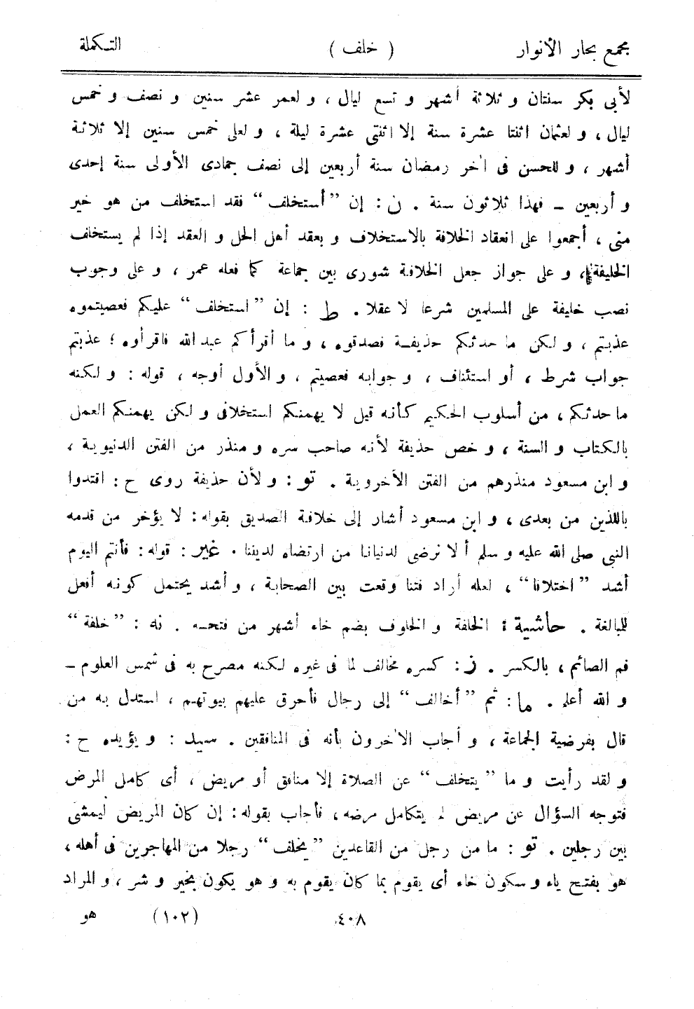 لأبي بكر سنتان وثلاثة أشهر وتسع ليال، ولعمر عشر سنين ونصف وخمس ليال، ولعثمان اثنتا عشرة سنة إلا اثنتي عشرة ليلة، ولعلي خمس سنين إلا ثلاثة أشهر، وللحسن في آخر رمضان سنة أربعين إلى نصف جمادي الأولى سنة إحدى وأربعين - فهذا ثلاثون سنة. ن: إن "استخلف" فقد استخلف من هو خير مني، أجمعوا على انعقاد الخلافة بالاستخلاف وبعقد أهل الحل والعقد إذا لم يستخلف الخليفة، وعلى جواز جعل الخلافة شورى بين جماعة كما فعله عمر، وعلى وجوب نصب خليفة على المسلمين شرعًا لا عقلًا. ط: إن "استخلف" عليكم فعصبتموه عذبتم، ولكن ما حدثكم حذيفة فصدقوه، وما أقرأكم عبد الله فاقرأوه، عذبتم جواب شرط، أو استئنافن وجوابه فعصيتم، والأول أوجه، قوله: ولكنه ما حدثكم، من أسلوب الحكيم كأنه قيل لا يمهنكم استخلافي ولكن يهمنكم العمل بالكتاب والسنة، وخص حذيفة لأنه صاحب سره ومنذر من الفتن الدنيوية، وابن مسعود منذرهم من الفتن الأخروية. تو: ولأن حذيفة روى ح: اقتدوا باللذين من بعدي، وابن مسعود أشار إلى خلافة الصديق بقوله: لا يؤخر من قدمه النبي صلى الله عليه وسلم ألا نرضى لدنيانا من ارتضاء لديننا. غير: قوله: فأنتم اليوم أشد "اختلافًا"، لعله أراد فتنا وقعت بين الصحابة، وأشد يحتمل كونه أفعل للمبالغة. حاشية: الخلفة والخلوف بضم خاء أشهر من فتحه. نه: "خلفة" فم الصائم، بالكسر. ز: كسره مخالف لما في غيره لكنه مصرح به في شمس العلوم - والله اعلم. ما: ثم "أخالف" إلى رجال فأحرق عليهم بيوتهم، استدل به من قال بفرضية الجماعة، وأجاب الآخرون بأنه في المنافقين. سيد: ويؤيده ح: ولقد رأيت وما "يتخلف" عن الصلاة إلا منافق أو مريض، أي كامل المرض فتوجه السؤال عن مريض لم يتكامل مرضه، فأجاب بقوله: إن كان المريض ليمشي بين رجلين. تو: ما من رجل من القاعدين "يخلف" رجلًا من المهاجرين في أهله، هو بفتح ياء وسكون خاء أي يقوم بما كان يقوم به وهو يكون بخير وشر، والمراد