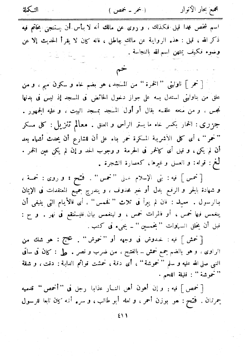 [خمر] ناوليني "الخمرة" من المسجد، هو بضم خاء وسكون ميم، ومن علق من يناوليني استدل به على جواز دخول الحائض في المسجد إذ ليس في بدنها نجس، ومن منعه علقه بقال أو أول المسجد بمسجد البيت، وعليه الجمهور. جزري: الخمار بكسر خاء ما يستر الرأس والعنق. معالم تنزيل: كل مسكر "خمر"، أي كل الأشربة المسكرة خمر بناء على أن للشارع أن يحدث أشياء بعد أن لم يكن، وقيل أي كالخمر في الحرمة ووجوب الحد وإن لم يكن عين الخمر. لغ: قوله: والعسل وغيرها، كعصارة الشجرة.