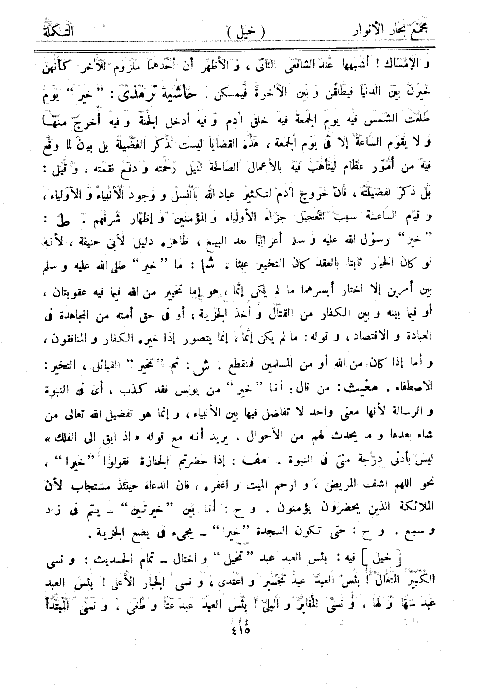 والإمساك! أشبهها عند الشافعي الثاني، والأظهر أن أحدهما ملزوم للآخر كأنهن خيرن بين الدنيا فيطلقن وبين الآخرة فيمسكن. حاشية ترمذي: "خير" يوم طلعت الشمس فيه يوم الجمعة فيه خلق أدم وفيه أدخل الجنة وفيه أخرج منها ولا يقوم الساعة إلا في يوم الجمعة، هذه القضايا ليست لذر الفضيلة بل بيان لما وقع فيه من أمور عظام ليتأهب فيه بالأعمال الصالحة لنيل رحمته ودفع نقمته، وقيل: بل ذكر لفضيلته، فإن خروج آدم لتكثير عباد الله بالنسل ووجود الأنبياء والأولياء، وقيام الساعة سبب لتعجيل جزاء الأولياء والمؤمنين وإظهار شرفهم. ط: "خير" رسول الله عليه وسلم أعرابيًا بعد البيع، ظاهره دليل لأبي حنيفة، لأنه لو كان الخيار ثابتًا بالعقد كان التخيير عبثًا. شا: ما "خير" صلى الله عليه وسلم بين أمرين إلا اختار أيسرهما ما لم يكن إثمًان هو ما تخيير من الله فيما فيه عقوبتان، أو فيما بينه وبين الكفار من القتال وأخذ الجزية، أو في حق أمته من المجاهدة في العبادة والاقتصاد، وقوله: ما لم يكن إثمًا، إنما يتصور إذا خيره الكفار والمنافقون، وأما إذا كان من الله أو من المسلمين فمنقطع. ش: ثم "تخير" القبائل، التخير الاصطفاء. مغيث: من قال: أنا "خير" من يونس فقد كذبن أي في النبوة والرسالة لأنها معنى واحد لا تفاضل فيها بين الأنبياء، وإنما هو تفضيل الله تعالى من شاء بعدها وما يحدث لهم من الأحوال، يريد أنه مع قوله "إذ ابق إلى الفلك" ليس بأدنى درجة متى في النبوة. مف: إذا حضرت الجنازة فقولوا "خيرًا"، نحو اللهم اشف المريض، وارحم الميت واغفره، فإن الدعاء حينئذ مستجاب لأن الملائكة الذين يحضرون يؤمنون. وح: أنا بين "خيرتين" - يتم في زاد وسبع. وح: حتى تكون السجدة "خيرًا" - يجيء في يضع الجزية.