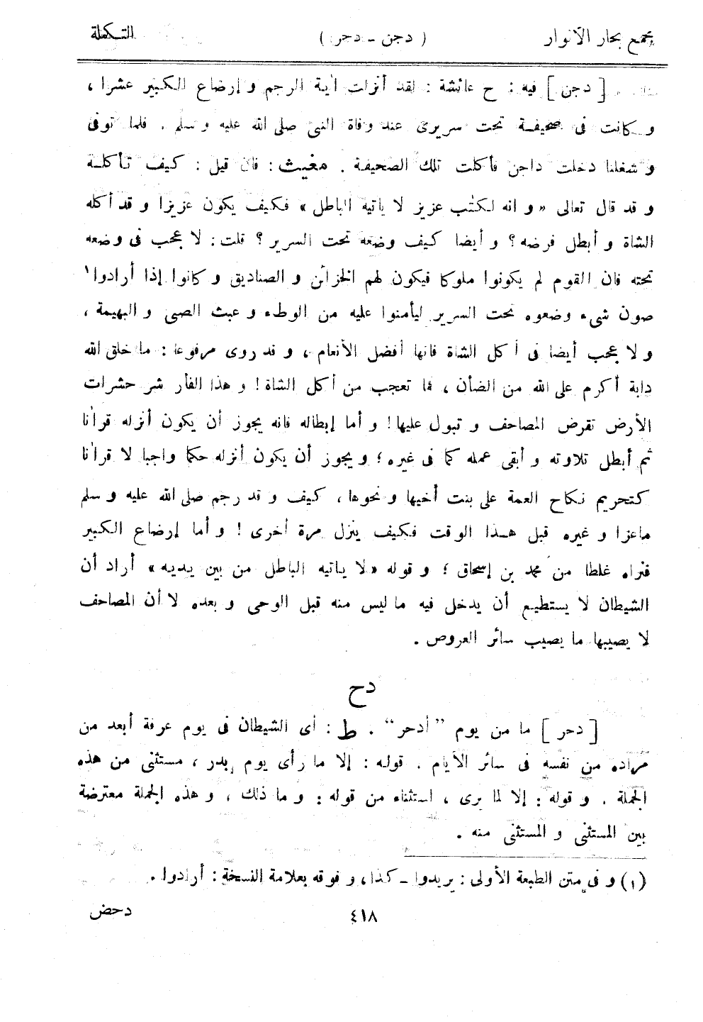 [دجن] فيه: ح عائشة: لقد أنزلت آية الرجم وإرضاع الكبير عشرًا، وكانت في صحيفة تحت سريري عند وفاة النبي صلى الله عليه وسلم، فلما توفى وشغلنا دخلت داجن فأكلت تلك الصحيفة. مغيث: فإن قيل: كيف تأكله وقد قال تعالى "وأنه لكتاب عزيز لا يأتيه الباطل" فكيف يكون عزيزًا وقد أكله الشاة وأبطل فرضه؟ وأيضًا كيف وضعه تحت السرير؟ قلت: لا عجب في وضعه تحته فإن القوم لم يكونوا ملوكًا فيكون لهم الخزائن والصناديق وكانوا إذا أرادوا صون شيء وضعوه تحت السرير ليأمنوا عليه من الوطء وعبث الصبي والبهيمة، ولا عجب أيضًا في أكل الشاة فإنها أفضل الأنعام، وقد روى مرفوعًا: ما خلق الله دابة أكرم على الله من الضان، فما تعجب من أكل الشاة! وهذا الفأر شر حشرات الأرض نقرض المصاحف وتبول عليها! وأما إبطاله فإنه يجوز أن يكون أنزله قرآنا ثم أبطل تلاوته وأبقى عمله كما في غيره، ويجوز أن يكون أنزله حكمًا واجبًا لا قرآنا كتحريم نكاح العمة على بنت أخيها ونحوها، كيف وقد رجم صلى الله عليه وسلم ماعزًا وغيره قبل هذا الوقت فكيف ينزل مرة أخرى! وأما إرضاع الكبير فتراه غلطًا من محمد بن إسحاق؛ وقوله "لا يأتيه الباطل من بين يديه" أراد أن الشيطان لا يستطيع أن يدخل فيه ما ليس منه قبل الوحي وبعده لا أن المصاحف لا يصيبها ما يصيب سائر العروص.