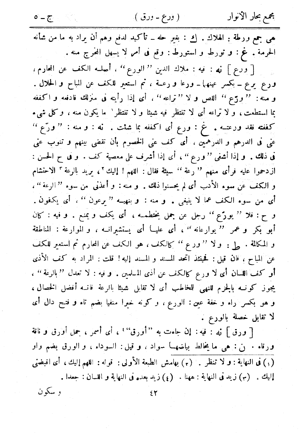 [ورع] نه: فيه: ملاك الدين "الورع"، أصله الكف عن المحارم، ورع يرع - بكسر عينهما - ورعا ورعة، ثم استعير للكف عن المباح والحلال. ومنه: "ورع" اللص ولا "تراعه"، أي إذا رأيته في منزلك فادفعه واكففه بما استطعت، ولا تراعه أي لا تنتظر فيه شيئًا ولا تنتظر ما يكون منه، وكل شيء كففته فقد ورعته. غ: ورع أي اكففه بما شئت. نه: ومنه: "ورع" عني في الدرهم والدرهمين، أي كف عني الخصوم بأن تقضي بينهم وتنوب عني في ذلك. وإذا أشفى "ورع"، أي إذا أشرف على معصية كف. وفي ح الحسن: ازدحموا عليه فرأى منهم "رعة" سيئة فقال: اللهم! إليك، يريد بالرعة الاحتشام والكف عن سوء الأدب أي لم يحسنوا ذلك. ومنه: وأعذني من سوء "الرعة"، أي من سوء الكف عما لا ينبغي. ومنه: وبنهيه "يرعون"، أي يكفون. وح: فلا "يورع" رجل عن جمل يختطمه، أي يكف ويمنع. وفيه: كان أبو بكر وعمر "بوارعانه"، أي عليا أي يستشيرانه، والموارعة: المناطقة والمكالمة. ط: ولا "ورع" كالكف، هو الكف عن المحارم ثم استعير للكف عن المباح، فإن قيل: فحينئذ اتحد المسند والمسند إليه! قلت: المراد به كف الأذى أو كف اللسان أي لا ورع كالكف عن أذى المسلمين. وفيه: لا تعدل "بالرعة"، يجوز كونه بالجزم للنهي للمخاطب أي لا تقابل شيئًا بالرعة فإنه أفضل الخصال، وهو بكسر راء وخفة عين: الورع، وكونه خبرًا منفيًا بضم تاء وفتح دال أي لا تقابل خصلة بالورع.