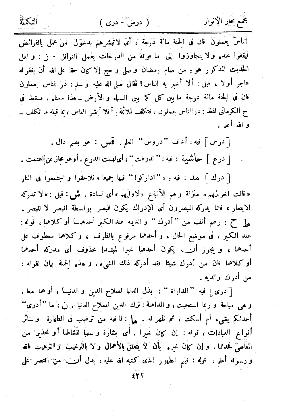 [درك] مد: فيه: ""اداركوا" فيها جميعًا" تلاحقوا واجتمعوا في النار "قالت أخراهم" منزلة وهم الأتباع "لا ولاهم" أي السادة. ش: قيل "لا تدركه الأبصار" فإنما يدكره المبصرون أي الإدراك يكون للمبصر بواسطة البصر لا للبصر. ط ح: رغم أنف من "أدرك" والديه عند الكبر أحدهما أو كلاهما، قوله: عند الكبر، في موضع الحال، وأحدهما مرفوع بالظرف، وكلاهما، قوله: عند الكبرن في موضع الحال، وأحدهما مرفوع بالظرف، وكلاهما معطوف على أحدهما، ويجوز أن يكون أحدهما خبرًا لمبتدأ محذوف أي مدركه أحدهما أو كلاهما فإن من أدرك شيئًا فقد أدركه ذلك الشيء، وهذه الجملة بيان لقوله: من أدرك والديه.