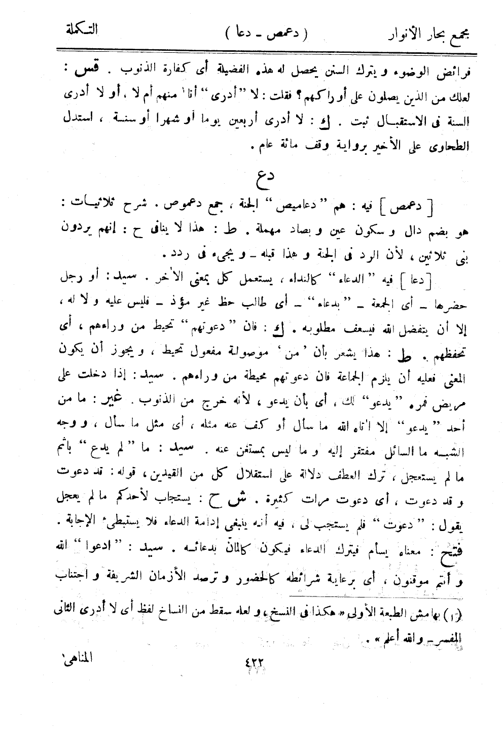 [دعا] فيه "الدعاء" كالنداء، يستعمل كل بمعنى الآخر. سيد: أو رجل حضرها - أي الجمعة - "بدعاء" - أي طالب حظ غير مؤذ - فليس عليه ولا له، إلا أن يتفضل الله فيسعف مطلوبه. ك: فإن "دعوتهم" تحيط من وراءهم، أي تحفظهم. ط: هذا يشعر بأن "من" موصولة مفعول تحيط، ويجوز أن يكون المعنى فعليه أن يلزم الجماعة فإن دعوتهم محيطة من وراءهم. سيد: إذا دخلت على مريض فمره "يدعو" لك، أي بأن يدعو، لأنه خرج من الذنوب. غير: ما من أحد "يدعو" إلا آتاه الله ما سأل أو كف عنه مثله، أي مثل ما سأل، ووجه الشبه ما السائل مفتقر إليه وما ليس بمستغن عنه. سيد: ما "لم يدع" بإثم ما لم يستعجل، ترك العطف دلالة على استقلال كل من القيدين، قوله: قد دعوت وقد دعوت، أي دعوت مرات كثيرة. ش ح: يستجاب لأحدكم ما لم يعجل يقول: "دعوت" فلم يستجب لي، فيه أنه ينبغي إدامة الدعاء فلا يستبطئ الإجابة. فتح: معناه يسأم فيترك الدعاء فيكون كالمانّ بدعائه. سيد: "ادعوا" الله وأنتم موقنون، أي برعاية شرائطه كالحضور وترصد الأزمان الشريفة واجتناب