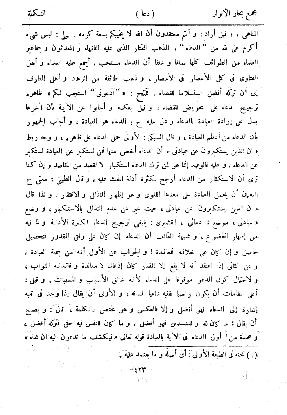 المناهي، وقيل أراد: وأنتم معتقدون أن الله لا يخيبكم بسعة كرمه. ط: ليس شيء أكرم على الله من "الدعاء"، المذهب المختار الذي عليه الفقهاء والمحدثون وجماهير العلماء من الطوائف كلها سلفًا وخلفًا أن الدعاء مستحب، أجمع عليه العلماء وأهل الفتاوى في كل الأعصار في الأمصار، وذهب طائفة من الزهاد وأهل المعارف إلى أن تركه أفضل استسلامًا للقضاء. فتح: ""ادعوني" استجب لكم" ظاهره ترجيح الدعاء على التفويض للقضاء، وقيل بعكسه وأجابوا عن الآية بأن أخرها يدل على إرادة العبادة بالدعاء ودل عليه ح: الدعاء هو العبادة، وأجاب الجمهور بأن الدعاء من أعظم العبادة، وقال السبكي: الأولى حمل الدعاء على ظاهره، ووجه ربط "أن الذين يستكبرون عن عبادتي" أن الدعاء أخص منها فمن استكبر عن العبادة استكبر عن الدعاء، وعيه فالوعيد إنما هو لمن ترك الدعاء استكبارًا لا لقصد من المقاصد وإن كنا ترى أن الاستكثار من الدعاء أرجح لكثرة أدلة الحث عليه، وقال الطيبي: معنى ح النعمان أن يحمل العبادة على معناها اللغوي وهو إظهار التذلل والافتقار، ولذا قال "إن الذين يستكبرون عن عبادتي" حيث عبر عن عدم التذلل بالاستكبار، ووضع "عبادتي" موضع: دعائي، القشيري: ينبغي ترجيح الدعاء لكثرة الأدلة ولما فيه من إظهار الخضوع، وشبهة المخالف أن الدعاء إن كان على وفق المقدور فتحصيل حاصل وإن كان على خلافه فمعاندة! والجواب عن الأول أنه من جملة العبادةن وعن الثاني إذا اعتقد أنه لا يقع إلا المقدر كان إذعانًا لا معاندة وفائدته الثواب، ولاحتمال كون المدعو موقوفًا على الدعاء لأنه خالق الأسباب والمسببات، وقيل: أعلى المقامات أن يكون راضيًا بقلبه داعيًا بلسانه، والأولى أن يقال إذا وجد في قلبه إشارة إلى الدعاء فهو أفضل وإلا فالعكس وهو مختص بالكلمة، قال: ويصح أن يقال: ما كان لله وللمسلمين فهو أفضل، وما كان للنفس فيه حق فتركه أفضل، وعمدة من أول الدعاء في الآية بالعبادة قوله تعالى "فيكشف ما تدعون إليه إن شاء"