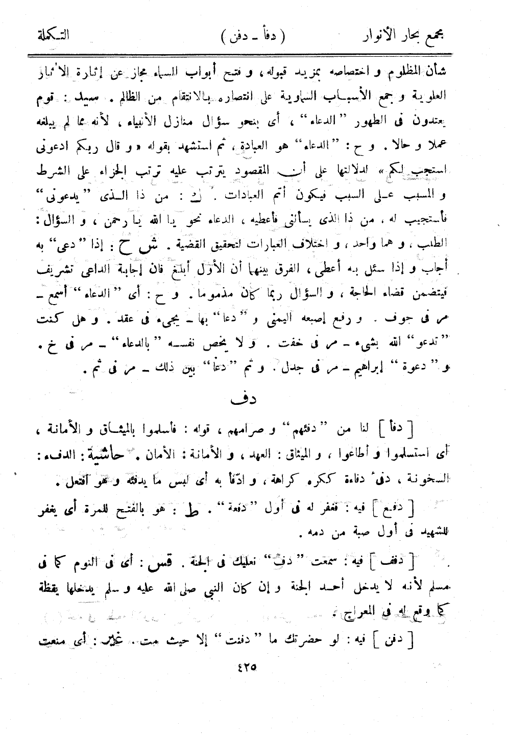 شأن المظلوم واختصاصه بمزيد قبوله، وفتح أبواب السماء مجاز عن إثارة الآثار العلوية وجمع الأسباب اسماوية على انتصاره بالانتقام من الظالم. سيد: قوم يعتدون في الطهور "الدعاء"، أي بنحو سؤال منازل الأنبياء، لأنه مما لم يبلغه عملًا وحالًا. وح: "الدعاء" هو العبادة، ثم استشهد بقوله "وقال ربكم ادعوني استجب لكم" لدلالتها على أن المقصود يترتب عليه ترتب الجزاء على الشرط والمسبب على السبب فيكون أتم العبادات. ك: من ذا الذي "يدعوني" فأستجيب له، من ذا الذي يسألني فأعطيه، الدعاء نحو يا الله يا رحمن، والسؤال: الطلب، وهما واحد، واختلاف العبارات لتحقيق القضية. ش ح: إذا "دعى" به أجاب وإذا سئل به أعطى، الفرق بينهما أن الأول أبلغ فإن إجابة الداعي تشريف فيتضمن قضاء الحاجة، والسؤال ربما كان مذمومًا. وح: أي "الدعاء" أسمع - مر في جوف. ورفع إصبعه اليمنى و"دعا" بها - يجيء في عقد. وهل كنت "تدعو" الله بشيء - مر في خفت. ولا يخص نفسه "بالدعاء"- مر في خ. و"دعوة" إبراهيم - مر في جدل. وثم "دعا" بين ذلك- مر في ثم.