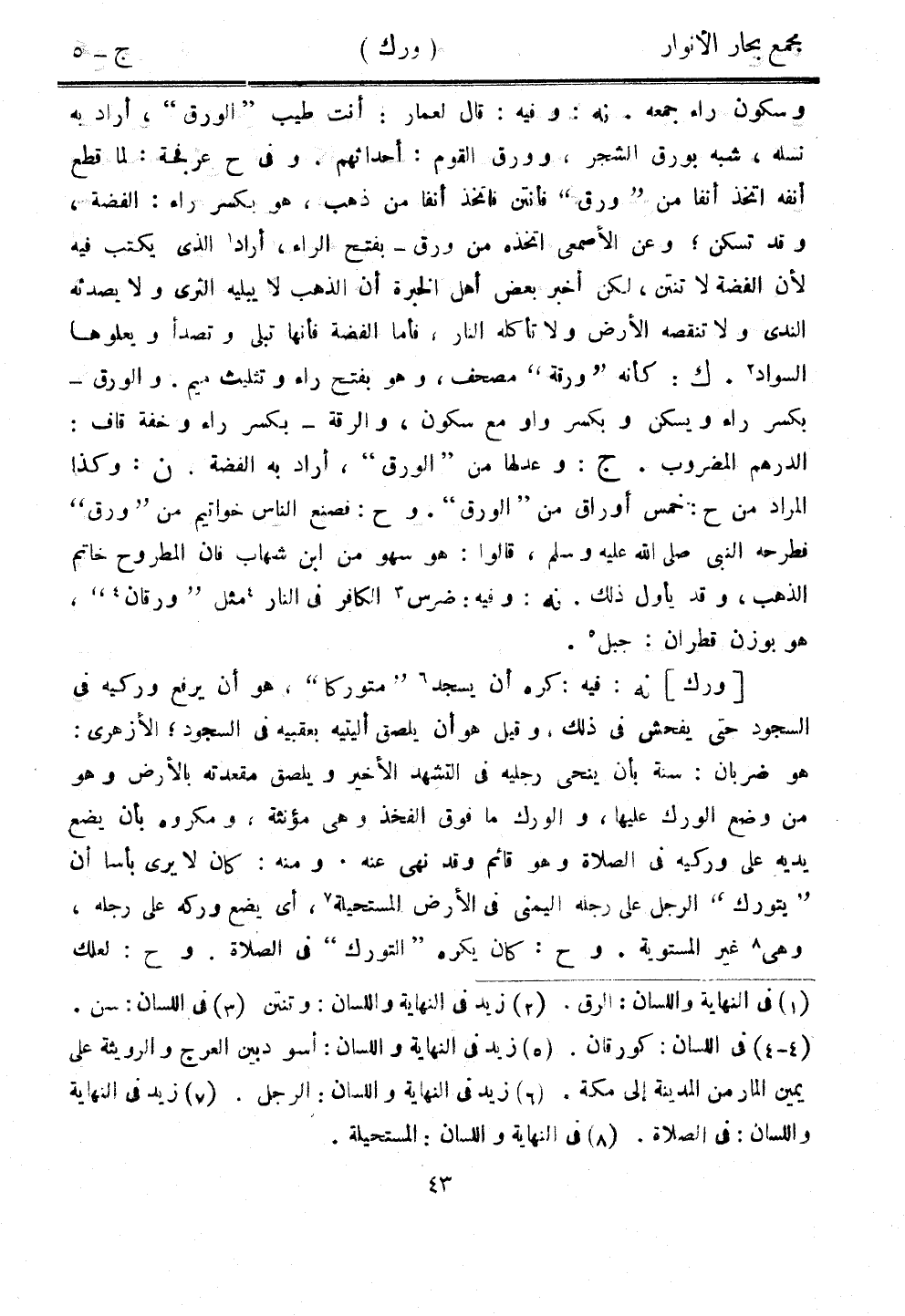[ورك] نه: فيه: كره أن يسجد "متوركا"، هو أن يرفع وركيه في السجود حتى يفحش في ذلك، وقيل هو أن يلصق أليتيه بعقبيه في السجود؛ الأزهري: هو ضربان: سنة بأن ينحى رجليه في التشهد الأخير ويلصق مقعدته بالأرض وهو من وضع الورك عليها، والورك ما فوق الفخذ وهي مؤنثة، ومكروه بأن يضع يديه على وركيه في الصلاة وهو قائم وقد نهى عنه. ومنه: كان لا يرى بأسًا أن "يتورك" الرجل على رجله اليمنى في الأرض المستحيلة، أي يضع وركه على رجله، وهي غير المستوية. وح: كان يكره "التورك" في الصلاة. وح: لعلك