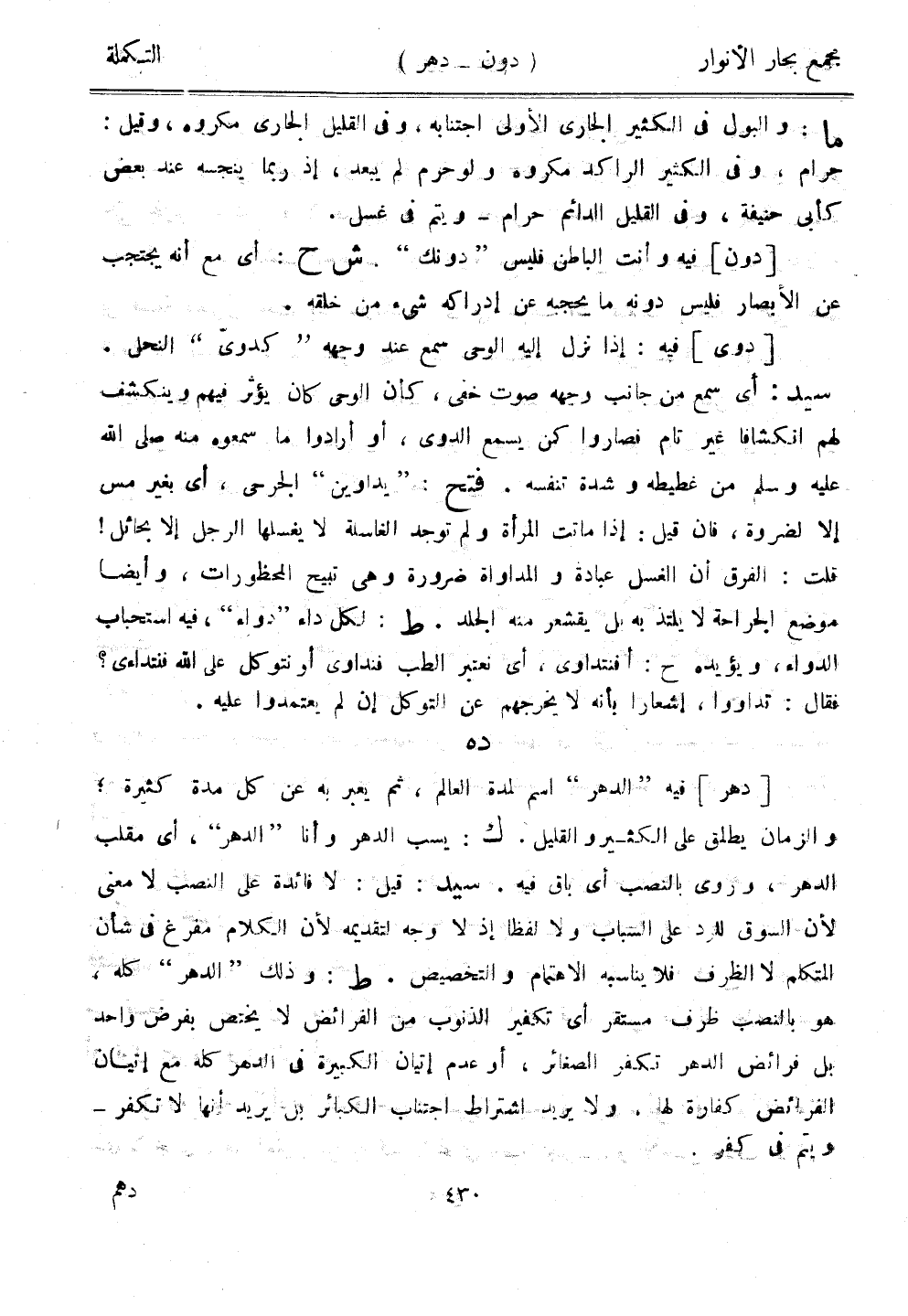 [دهر] فيه "الدهر" اسم لمدة العالم، ثم يعبر به عن كل مدة كثيرة، والزمان يطلق على الكثير والقليل. ك: يسب الدهر وأنا "الدهر"، أي مقلب الدهر، وروى بالنصب أي باق فيه. سيد: قبل: لا فائدة على النصب لا معنى لأن السوق للرد على الشباب ولا لفظًا إذ لا وجه لتقديمه لأن الكلام مفرغ في شأن المتكلم لا الظرف فلا يناسبه الاهتمام والتخصيص. ط: وذلك "الدهر" كله، هو بالنصب ظرف مستقر أي تكفير الذنوب من الفرائض لا يختص بفرض واحد بل فرائض الدهر تكفر الصغائر، أو عدم إتيان الكبيرة في الدهر كله مع إتيان الفرائض كفارة لهانولا يريد اشتراط اجتناب الكبائر بل يريد أنها لا تكفر - ويتم في كفر.