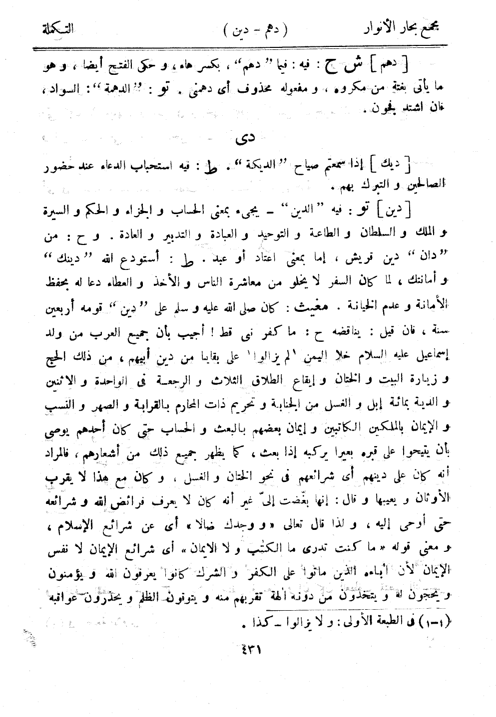 [دين] تو: فيه "الدين" - يجيء بمعى الحساب والجزاء والحكم والسيرة والملك والسلطان والطاعة والتوحيد والعبادة والتدبير والعادة. وح: من "دان" دين قريش، إما بمعنى اعتاد أو عبد. ط: استودع الله "دينك" وأمانتك، لما كان السفر لا يخلو من معاشرة الناس والأخذ والعطاء دعا له بحفظ الأمانة وعدم الخيانة. مغيث: كان صلى الله عليه وسلم على "دين" قومه أربعين سنة، فإن قيل: يناقضه ح: ما كفر نبي قط! أجيب بأن جميع العرب من ولد إسماعيل عليه السلام خلا اليمن لم يزالوا على بقايا من دين أبيهم، من ذلك الحج وزيارة البيت والختان وإيقاع الطلاق الثلاث والرجعة في الواحدة والاثنين والدية بمائة إبل والغسل من الجنابة وتحريم ذات المحارم بالقرابة والصهر والنسب والإيمان بالملكين الكاتبين وإيمان بعضهم بابعث والحساب حتى كان أحدهم يوصي بأن يتيحوا على قبره بعيرًا يركبه إذا بعث، كما يظهر جميع ذلك من أشعارهم، فالمراد أنه كان على دينهم أي شرائعهم في نحو الختان والغسل، وكان مع هذا لا يقرب الأوثان ويعيبها وقال: إنها بغضت إليّ غير أنه كان لا يعرف فرائض الله وشرائعه حتى أوحى إليه، ولذا قال تعالى "ووجدك ضالًا" أي عن شرائع الإسلام، ومعنى قوله "ما كنت تدري ما الكتاب ولا الإيمان" أي شرائع الإيمان لا نفس الإيمان لأن آباءه الذين ماتوا على الكفر والشرك كانوا يعرفون الله ويؤمنون ويحجون له ويتخذون من دونه آلهة تقربهم منه ويتوقون الظلم ويحذرون عواقبه