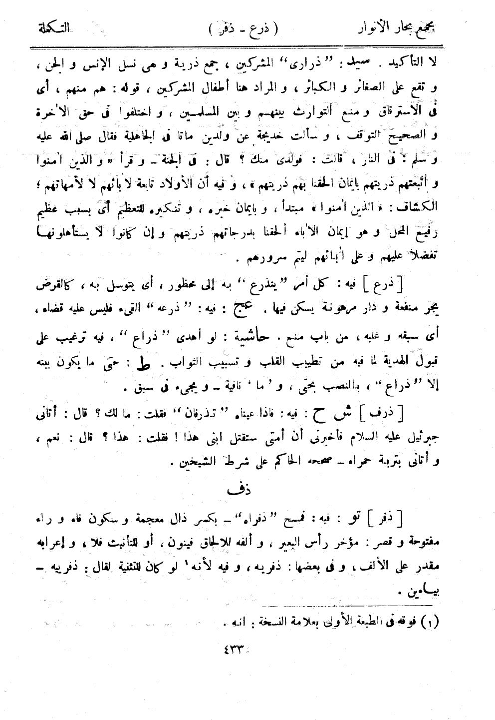 [ذرف] ش ح: فيه: فإذا عيناه "تذرفان" فقلت: ما لك؟ قال: أتاني جبرئيل عليه السلام فأخبرني أن أمتي ستقتل ابني هذا! فقلت: هذا؟ قال: نعم، وأتاني بتربة حمراء - صححه الحاكم على شرط الشيخين.