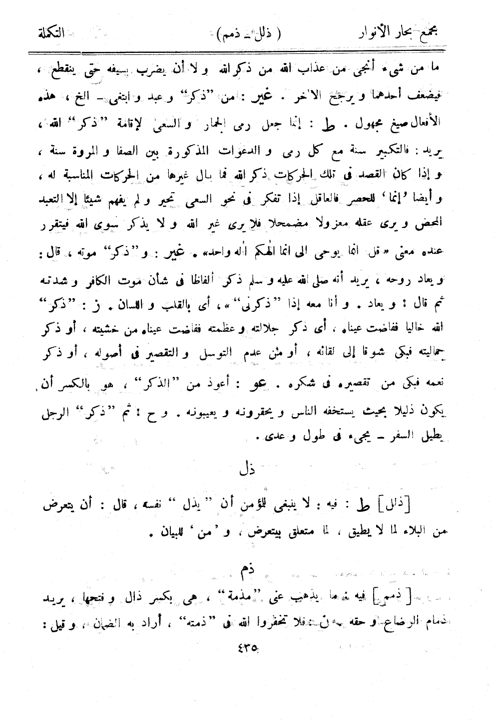 ما من شيء أنجى من عذاب الله من ذكر الله ولا أن يضرب بسيفه حتى ينقطع، فيضعف أحدهما ويرجح الآخر. غير: من "ذكر" وعبد وابتغى -إلخ، هذه الأفعال صيغ مجهول. ط: إنما جعل رمي المار والسعي لإقامة "ذكر" الله، يريد: فالتكبير سنة مع كل رمي والدعوات المذكورة بين الصفا والمروة سنة، وإذا كان القصد في تلك الحركات ذكر الله فما بال غيرها من الحركات المناسبة له، وأيضًا "إنما" للحصر فالعاقل إذا تفكر في نحو السعي تحير ولم يفهم شيئًا إلا التعبد المحض ويرى عقله معزولًا مضمحلًا فلا يرى غير الله ولا يذكر سوى الله فيتقرر عنده معنى "قل إنما يوحى إلي إنما إلهكم إله واحد". غير: و"ذكر" موته، قال: ويعاد روحه، يريد أنه صلى الله عليه وسلم ذكر ألفاظًا في شأن موت الكافر وشدته ثم قال: ويعاد. وأنا معه إذا "ذكرني""، أي بالقلب واللسان. ز: "ذكر" الله خاليًا ففاضت عيناه، أي ذكر جلالته وعظمته ففاضت عيناه من خشيته، أو ذكر جماليته فبكى شوقًا إلى لقائه، أو من عدم التوسل والتقصير في أصوله، أو ذكر نعمه فبكى من تقصيره في شكره. عو: أعوذ من "الذكر"، هو بالكسر أن يكون ذليلًا بحيث يستخفه الناس ويحقرونه ويعيبونه. وح: ثم "ذر" الرجل يطيل السفر- يجيء في طول وعدي.