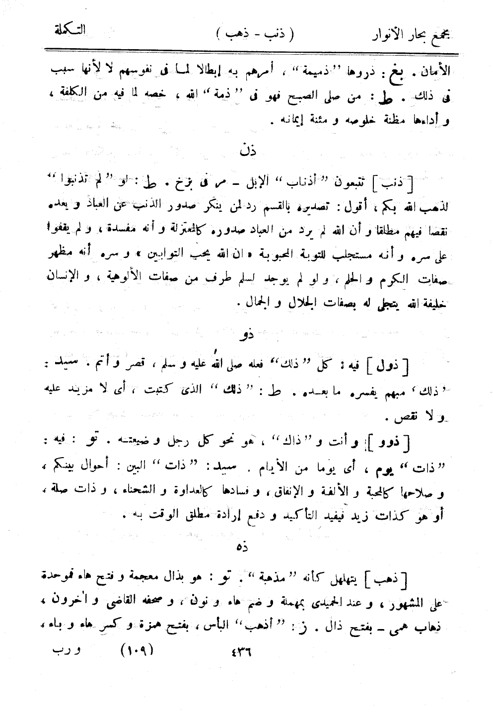 [ذنب] تتبعون "أذناب" الإبل - مر في بزخ. ط: لو "لم تذنبوا" لذهب الله بكم، أقول: تصديره بالقسم رد لمن ينكر صدور الذنب عن العباد ويعده نقصًا فيهم مطلقًا وأن الله لم يرد من العباد صدوره كالمعتزلة وأنه مفسدة، ولم يقفوا على سره وأنه مستجلب للتوبة المحبوبة "أن الله يحب التوابين" وسره أنه مظهر صفات الكرم والحلم، ولو لم يوجد لسلم طرف من صفات الألوهية، والإنسان خليفة الله يتجلى له بصفات الجلال والجمال.