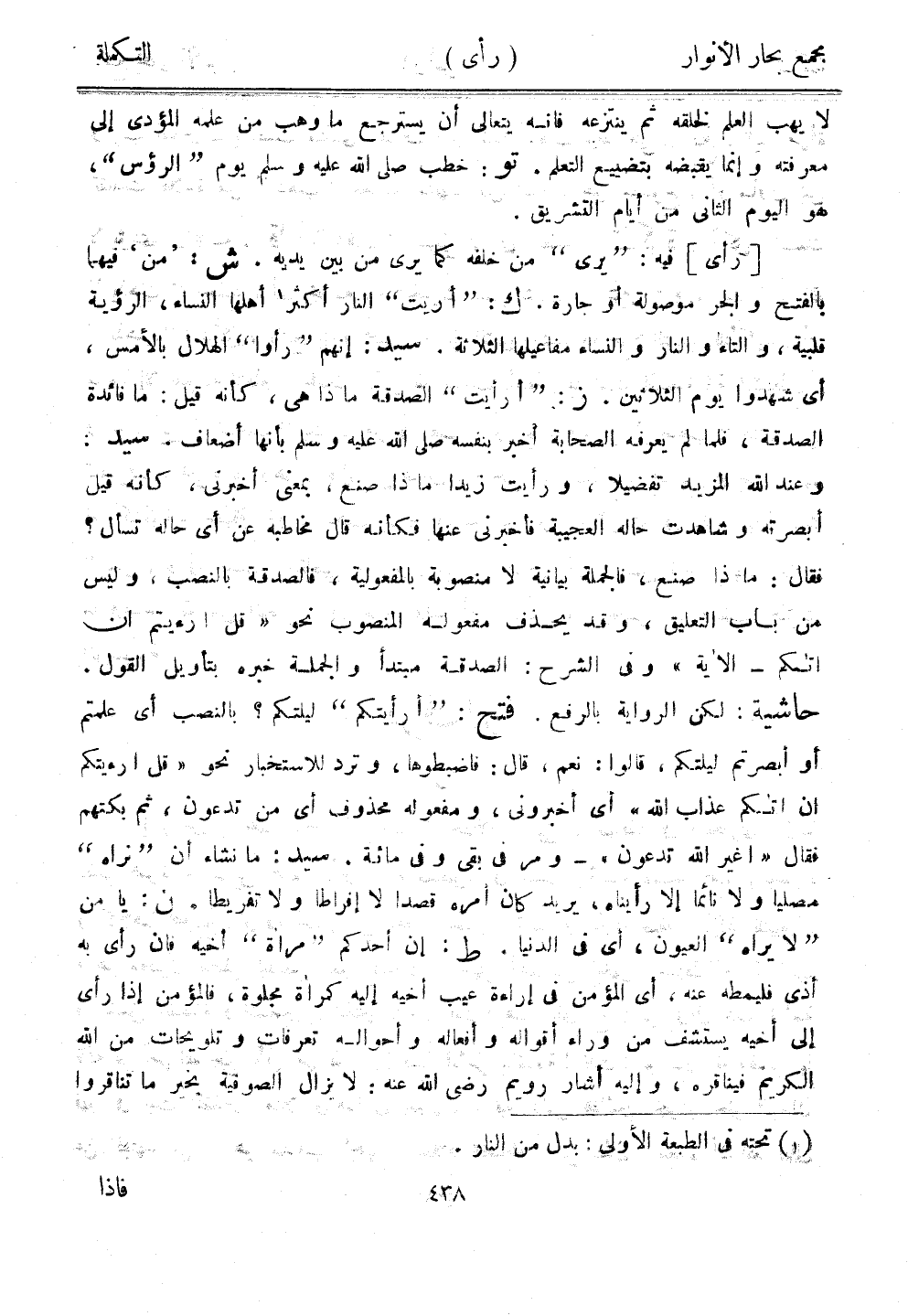 [رأى] فيه: "يرى" من خلفه ما يرى من بين يديه. ش: "من" فيهما بالفتح والجر موصولة أو جارة. ك: "أريت" النار أكثر أهلها النساء، الرؤية قلبية، والتاء والنار والنساء مفاعيلها الثلاثة. سيد إنهم "رأوا" الهلال بالأمس، أي شهدوا يوم الثلاثين. ز: "أرأيت" الصدقة ماذا هي، كأنه قيل: ما فائدة الصدقة، فلما لم يعرفه الصحابة أخبر بنفسه صلى الله عليه وسلم بأنها أضعاف. سيد: وعند الله المزيد تفضيلًا، ورأيت زيدًا ماذا صنع، بمعنى أخبرني، كأنه قيل أبصرته وشاهدت حاله العجيبة فأخبرني عنها فأنه قال مخاطبه عن أي حاله تسأل؟ فقال: ماذا صنع، فالجملة بيانية لا منصوبة بالمفعولية، فالصدقة بالنصب، وليس من باب التعليقن وقد يحذف مفعوله المنصوب نحو "قل أرأيتم أن أتاكم - الآية" وفي الشرح الصدقة مبتدأوالجملة خبره بتأويل القول. حاشية لن الرواية بالرفع. فتح: "أرأيتكم" ليلتكم؟ بالنصب أي علمتم أو أبصرتم ليلتكم، قالوا: نعم، قال: فاضبطوها، وترد للاستخبار نحو "قل أرأيتكم إن آتاكم عذاب الله" أي أخبروني، ومفعوله محذوف أي من تدعون، ثم بكتهم فقال "أغير الله تدعون" - ومر في بقى وفي مائة. سيد: ما نشاء أن "نراه" مصليا ولا نائمًا إلا رأيناه، يريد كان أمره قصدًا لا إفراطًا ولا تفريطًا. ن: يا من "لا يراه" العيون، أي في الدنيا. ط: إن أحدكم "مرآة" أخيه فإن رأي به أذى فليمطه عنه، أي المؤمن في إراءة عيب أخيه غليه كمرآة مجلوة، فالمؤمن إذا رأى إلى أخيه يستشف من وراء أقواله وأفعاله وأحواله تعرفات وتلويحات من الله الكريم فيناقره، وإليه أشار رويم رضي الله عنه: لا يزال الصوفية بخير ما تناقروا