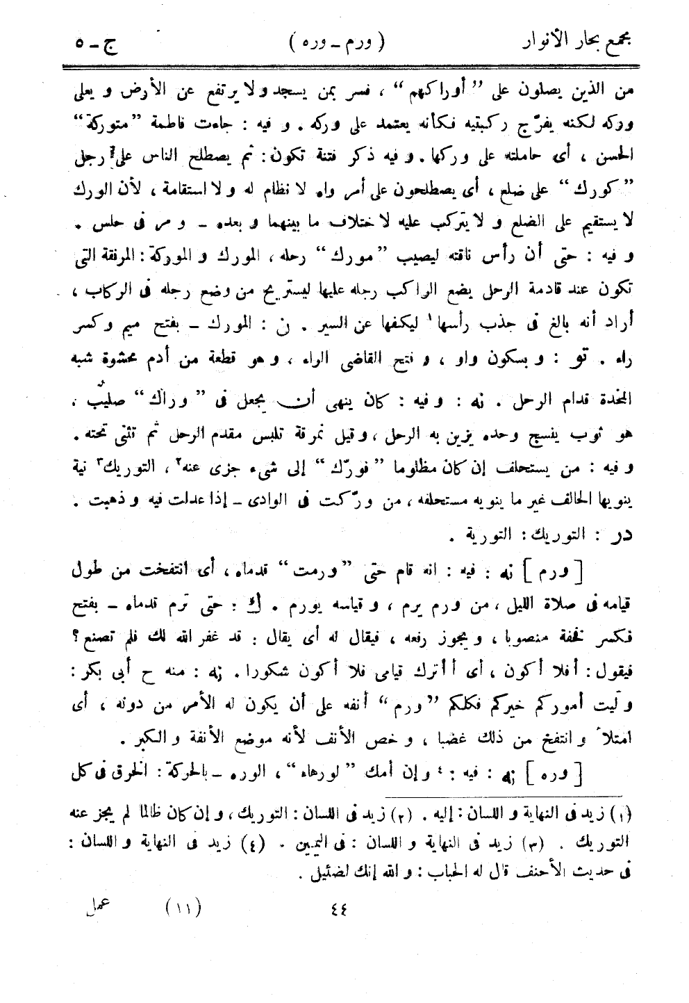 من الذين يصلون على "أوراكهم"، فسر بمن يسجد ولا يرتفع عن الأرض ويعلي وركه لكنه يفرج ركبتيه فكأنه يعتمد على وركه. وفيه: جاءت فاطمة "متوركة" الحسن، أي حاملته على وركها. وفيه ذكر فتنة تكون: ثم يصطلح الناس على رجل "كورك" على ضلع، أي يصطلحون على أمر واه لا نظام له ولا استقامة، لأن الورك لا يستقيم على الضلع ولا يتركب عليه لاختلاف ما بينهما وبعده - ومر في حلس. وفيه: حتى أن رأس ناقته ليصيب "مورك" رحله، المورك والموركة: المرفقة التي تكون عند قادمة الرحل يضع الراكب رجله عليها ليستريح من وضع رجله في الركاب، أراد أنه بالغ في جذب رأسها ليكفها عن السير. ن: المورك - بفتح ميم وكسر راء. تو: وبسكون واو، وفتح القاضي الراء، وهوقطعة من أدم محشوة شبه المخدة قدام الرحل. نه: وفيه: كان ينهي أني جعل في "وراك" صليب، هو ثوب ينسج وحده يزين به الرحل، وقيل نمرقة تلبس مقدم الرحل ثم تثني تحته. وفيه: من يستحلف إن كان مظلومًا "فورك" إلى شيء جزى عنه، التوريك نية ينويها الحالف غير ما ينويه مستحلفه، من وركت في الوادي - إذا عدلت فيه وذهبت. در: التوريك: التروية.