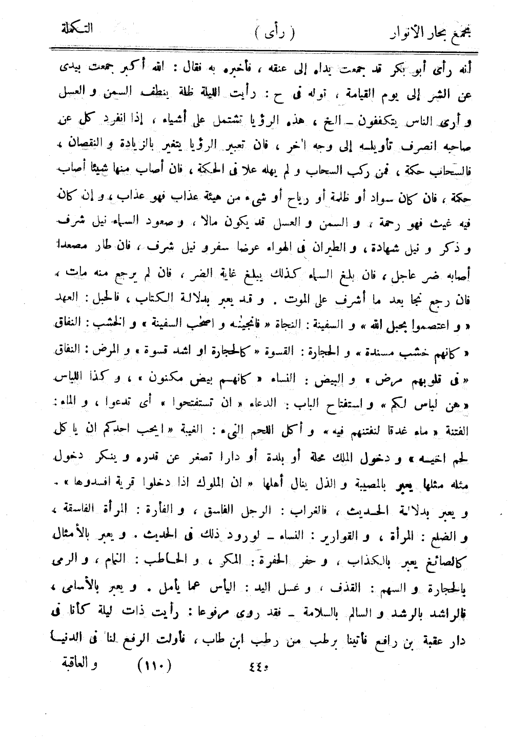 أنه رأى أبو بكر قد جمعت يداه إلى عنقه، فأخبره به فقال: الله أكبر جمعت بيدي عن الشر إلى يوم القيامة، قوله في ح: رأيت الليلة ظلة بنطف السمن والعسل وأرى الناس يتكففون -إلخ، هذه الرؤيا تشتمل على أشياء، إذا انفرد كل عن صاحبه انصرف تأويله إلى وجه آخر، فإن تعبير الرؤيا يتغير بالزيادة والنقصان، فالسحاب حكمة، فمن ركب السحاب ولم يهله علا في الحكمة، فإن أصاب منها شيئًا أصاب حكمة، فإن كان سواد أو ظلمة أو رياح أو شيء من هيئة عذاب فهو عذاب، وإن كان فيه غيث فهو رحمة، والسمن والعسل قد يكون مالًا، وصعود السماء نيل شرف وذكر ونيل شهادة، والطيران في الهواء عرضًا سفر ونيل شرف، فإن طار مصعدًا أصابه ضر عاجل، فإن بلغ السماء كذلك يبلغ غاية الضر، فإن لم يرجع منه مات، فإن رجع نجا بعد ما أشرف على الموت. وقد يعبر بدلالة الكتاب، فالحبل: العهد "واعتصموا بحبل الله" والسفينة: النجاة "فأنجيناه وأصحاب السفينة" والخشب: النفاق "كأنهم خشب مسندة" والحجارة: القسوة "كالحجارة أو أشد قسوة" والمرض: النفاق "في قلوبهم مرض" والبيض: النساء "كأنهن بيض مكنون"، وكذا اللباس "هن لباس لم" واستفتاح الباب: الدعاء "أن تستفتحوا" أي تدعوا، والماء: الفتنة "ماء غدقا لنفتنهم فيه" واكل اللحم النيء: الغيبة "أيحب أحدكم أن يأكل لحم أخيه" ودخول الملك محلة أو بلدة أو دارًا تصغر عن قدره وينكر دخول مثله مثلها يعبر بالمصيبة والذل ينال أهلها "أن الملوك إذا دخلوا قرية أفسدوها". ويعبر بدلالة الحديث، فالغراب: الرجل الفاسق، والفأرة: المرأة الفاسقة، والضلع: المرأة، والقوارير: النساء- لورود ذلك في الحديث. ويعبر بالأمثال كالصائغ يعبر بالكذاب، وحفر الحفرة: المكر، الحاطب: النمام، والرمي بالحجارة والسهم: القذف، وغسل اليد: اليأس عما يأمل. ويعبر بالسامى، فالراشد بالرشد والسالم بالسلامة - فقد روى مرفوعًا: رأيت ذات ليلة كأنا في دار عقبة بن رافع فأتينا برطب من رطب ابن طاب، فأولت الرفع لنا في الدنيا