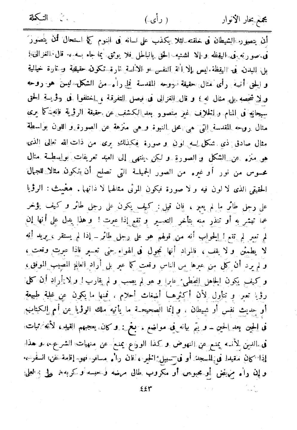 أن يتصور الشيطان في خلقته لئلا يكذب على لسانه في النوم كما استحال أن يتصور في صورته في اليقظة وألا اشتبه الحق بالباطل فلا يوثق بما جاء به، قال الغزالي: بل البدن في اليقظة ليس إلا آلة النفس والآلة تارة تكون حقيقية وتارة خيالية والحق أنه رأى مثال حقيقة روحه المقدسة فما رآه من الشكل ليس هو روحه ولا شخصه بل مثال له، وقال الغزالي في فيصل التفرقة، واختلفوا في رؤية الحق سبحانه في المنام والخلاف غير متصور بعد الكشف عن حقيقة الرؤية فإنه كما يرى مثال روحه المقدسة التي هي محل النبوة وهي منزهة عن الصورة واللون بواسطة مثال صادق ذي شكل له لون وصورة فكذل يرى من ذات الله تعالى الذي هو منزه عن الشكل والصورة ولكن ينتهي على العبد تعريفات بواسطة مثال محسوس من نور أو غيره من الصور الجميلة التي تصلح أن تكون مثالًا للجمال الحقيقي الذي لا لون فيه ولا صورة فيكون المرئي مثالها لا ذاتهما. مغيث: الرؤيا على رجل طائر ما لم يعبر، فإن قيل: كيف يكون على رجل طائر وكيف يؤخر عما تبشر به أو تنذر منه بتأخر التعسير وتقع إذا عبرت! وهذا يدل على أنها عن لم تعبر لم تقع! الجواب أنه من قولهم هو على رجل طائر - إذا لم يستقر، يريد أنه لا يطمئن ولا يقف، فالمراد أنها تجول في الهواء حتى تعبر فإذا عبرت وقعت، ولم يرد أن كل من عبرها من الناس وقعت كما عبر بل أراد العالم المصيب الموفق، وكيف يكون الجاهل المخطئ عابرًا وهو لم يصب ولم يقارب! ولا أراد أن كل رؤيا تعبر وتتأول لأن أكثرها أضغاث أحلام، فمنها ما يكون عن غلبة طبيعة أو حديث نفس أو شيطان، وغنما الصحيحة ما يأتيه ملك الرؤيا عن أم الكتاب في الحين بعد الحين - ويتم بيانه في مواضع. بغ: وكان يعجبهم القيد، لأنه ثبات ف الدين لأنه يمنع عن النهوض وكذا الورع يمنع عن منهيات الشرع، وهذا إذا كان مقيدًا في المسجد أو في سبيل الخير، فإن رآه مسافر فهو إقامة عن السفر، وإن رآه مريض أو محبوس او مكروب طال مرضه وحبسه وكربه. ط: لعلي