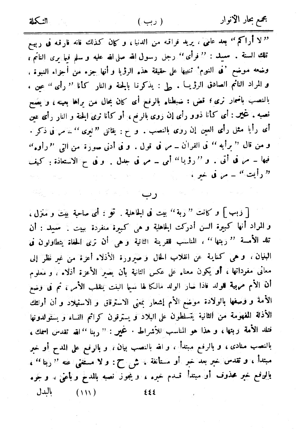 [ربب] وكانت "ربة" بيت في الجاهلية. تو: أي صاحبة بيت ومنزل، والمراد أنها كبيرة السن أدركت الجاهلية وهي كبيرة منفردة ببيت. سيد: أن تلد الأمة "ربتها"، المناسب للقرينة الثانية وهي أن ترى الحفاة يتطاولون في البنيان، وهي كناية عن انقلاب الحال وصيرورة الأذلاء أعزة من غير نظر على معاني مفرداتها، أو يكون معناه على عكس الثانية بأن يصير الأعزة أذلاء، ومعلوم أن الأم مربية للولد فإذا صار الولد مالكًا لها سيما البنت ينقلب الأمر، ثم في وضع الأمة ووصفها بالولادة موضع الأم إشعار بمعنى الاسترقاق والاستيلاد وأن أولئك الأذلة المفهومة من الثانية يتسلطون على البلاد ويسترقون كرائم النساء ويستولدونها فتلد الأمة ربتها، وهذا هو المناسب للأشراط. غير:"ربنا" الله تقدس اسمك، بالنصب منادى، وبالرفع مبتدأ، والله بالنصب بيان، وبالرفع على المدح أو خبر مبتدأ، وتقدس خبر بعد خبر أو مستأنفة. ش ح: ولا مستغنى عنه "ربنا"، بالرفع خبر محذوف أو مبتدأ قدم خبرهن ويجوز نصبه بالمدح وبأعني، وجره